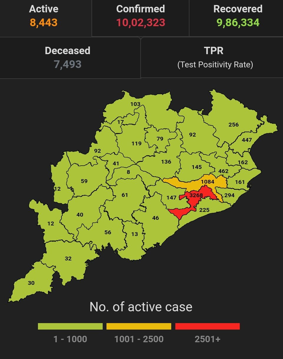 ଭୁବନେଶ୍ବର ୨୪/୦୮(ପିପିଟି); ରାଜ୍ୟରେ ନୂତନ ଆକ୍ରାନ୍ତ ସଂଖ୍ୟା ୬୨୫ । ପଜିଟିଭ ସଂଖ୍ୟା ୧୦,୦୨,୩୨୩ ଚିହ୍ନଟ ହୋଇଛନ୍ତି ୯,୮୬,୩୩୪ ଜଣ ସୁସ୍ଥ ହୋଇଥିବା ବେଳେ ୮,୪୪୩ ଜଣ ଚିକିତ୍ସିତ ହେଉଛନ୍ତି ଏବଂ ୭୪୯୩ ଜଣଙ୍କର ମୃତ୍ୟୁ ଘଟିଛି ଏବଂ ଅନ୍ଯ ମୃତ୍ୟୁ ୫୩ ହୋଇଛି । ଖୋର୍ଦ୍ଧା ଜିଲ୍ଲାରେ ଆକ୍ରାନ୍ତ ସଂଖ୍ୟା ୧,୫୮,୪୪୬ ସୁସ୍ଥ ସଂଖ୍ୟା ୧,୫୩,୭୪୭ ଚିକିତ୍ସିତ ସଂଖ୍ୟା ୩,୨୬୮, ମୃତ ସଂଖ୍ୟା ୧୪୨୧ କଟକ ଜିଲ୍ଲାରେ ଆକ୍ରାନ୍ତ ସଂଖ୍ୟା ୮୯,୯୫୫ ସୁସ୍ଥ ସଂଖ୍ୟା ୮୮,୨୨୯ ଚିକିତ୍ସିତ ସଂଖ୍ୟା ୧,୦୮୪, ମୃତ ସଂଖ୍ୟା ୬୩୮, ଗଞ୍ଜାମ ଜିଲ୍ଲାରେ ଆକ୍ରାନ୍ତ ସଂଖ୍ୟା ୩୩,୫୭୬ ସୁସ୍ଥ ସଂଖ୍ୟା ୩୩,୦୫୫ ଚିକିତ୍ସିତ ସଂଖ୍ୟା ୪୬, ମୃତ ସଂଖ୍ୟା ୪୬୭, ସୁନ୍ଦରଗଡ ଜିଲ୍ଲାରେ ଆକ୍ରାନ୍ତ ସଂଖ୍ୟା ୬୧,୦୬୨ ସୁସ୍ଥ ସଂଖ୍ୟା ୬୦,୩୮୫ ଚିକିତ୍ସିତ ସଂଖ୍ୟା ୧୦୩ ,ମୃତ ସଂଖ୍ୟା ୫୭୦, ମାଲକାନଗିରି ଜିଲ୍ଲାରେ ଆକ୍ରାନ୍ତ ସଂଖ୍ୟା ୧୧,୫୭୬ ସୁସ୍ଥ ସଂଖ୍ୟା ୧୧,୪୯୮ ଚିକିତ୍ସିତ ସଂଖ୍ୟା ୩୦ ,ମୃତ ସଂଖ୍ୟା ୪୫ ବୋଲି ସ୍ୱାସ୍ଥ୍ୟ ପରିବାର କଲ୍ୟାଣ ବିଭାଗ ତରଫରୁ ଏହି ସୂଚନା ମିଳିଛି।
