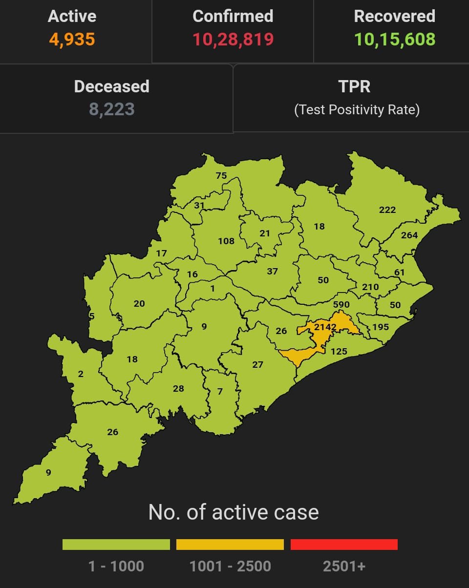 ଭୁବନେଶ୍ବର ୦୫/୧୦(ପିପିଟି); ରାଜ୍ୟରେ ନୂତନ ଆକ୍ରାନ୍ତ ସଂଖ୍ୟା ୪୫୩। ପଜିଟିଭ ସଂଖ୍ୟା ୧୦,୨୮,୮୧୯ ଚିହ୍ନଟ ହୋଇଛନ୍ତି ୧୦,୧୫,୬୦୮ ଜଣ ସୁସ୍ଥ ହୋଇଥିବା ବେଳେ ୪,୯୩୫ ଜଣ ଚିକିତ୍ସିତ ହେଉଛନ୍ତି ଏବଂ ୮୨୨୩ ଜଣଙ୍କର ମୃତ୍ୟୁ ଘଟିଛି ଏବଂ ଅନ୍ଯ ମୃତ୍ୟୁ ୫୩ ହୋଇଛି । ଖୋର୍ଦ୍ଧା ଜିଲ୍ଲାରେ ଆକ୍ରାନ୍ତ ସଂଖ୍ୟା ୧,୬୯,୧୩୮ ସୁସ୍ଥ ସଂଖ୍ୟା ୧,୬୫,୪୪୭ ଚିକିତ୍ସିତ ସଂଖ୍ୟା ୨,୧୪୨, ମୃତ ସଂଖ୍ୟା ୧୫୦୯ କଟକ ଜିଲ୍ଲାରେ ଆକ୍ରାନ୍ତ ସଂଖ୍ୟା ୯୩,୩୫୧, ସୁସ୍ଥ ସଂଖ୍ୟା ୯୧,୯୧୯ ଚିକିତ୍ସିତ ସଂଖ୍ୟା ୫୯୦, ମୃତ ସଂଖ୍ୟା ୮୩୮, ଗଞ୍ଜାମ ଜିଲ୍ଲାରେ ଆକ୍ରାନ୍ତ ସଂଖ୍ୟା ୩୩,୭୬୮ ସୁସ୍ଥ ସଂଖ୍ୟା ୩୩,୨୫୬ ଚିକିତ୍ସିତ ସଂଖ୍ୟା ୨୭ ମୃତ ସଂଖ୍ୟା ୪୭୭, ସୁନ୍ଦରଗଡ ଜିଲ୍ଲାରେ ଆକ୍ରାନ୍ତ ସଂଖ୍ୟା ୬୧,୫୮୮ ସୁସ୍ଥ ସଂଖ୍ୟା ୬୦,୯୨୮ ଚିକିତ୍ସିତ ସଂଖ୍ୟା ୭୫ ,ମୃତ ସଂଖ୍ୟା ୫୮୧ ବୋଲି ସ୍ୱାସ୍ଥ୍ୟ ପରିବାର କଲ୍ୟାଣ ବିଭାଗ ତରଫରୁ ଏହି ସୂଚନା ମିଳିଛି।