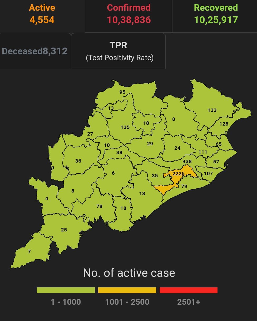 ଭୁବନେଶ୍ବର ୨୫/୧୦(ପିପିଟି); ରାଜ୍ୟରେ ନୂତନ ଆକ୍ରାନ୍ତ ସଂଖ୍ୟା ୪୨୫। ପଜିଟିଭ ସଂଖ୍ୟା ୧୦,୩୮,୮୩୬ ଚିହ୍ନଟ ହୋଇଛନ୍ତି ୧୦,୨୫,୯୧୭ ଜଣ ସୁସ୍ଥ ହୋଇଥିବା ବେଳେ ୪,୫୫୪ ଜଣ ଚିକିତ୍ସିତ ହେଉଛନ୍ତି ଏବଂ ୮୩୧୨ ଜଣଙ୍କର ମୃତ୍ୟୁ ଘଟିଛି ଏବଂ ଅନ୍ଯ ମୃତ୍ୟୁ ୫୩ ହୋଇଛି । ଖୋର୍ଦ୍ଧା ଜିଲ୍ଲାରେ ଆକ୍ରାନ୍ତ ସଂଖ୍ୟା ୧,୭୪,୦୫୪ ସୁସ୍ଥ ସଂଖ୍ୟା ୧,୭୦,୨୮୪ ଚିକିତ୍ସିତ ସଂଖ୍ୟା ୨,୨୨୬, ମୃତ ସଂଖ୍ୟା ୧୫୩୪ କଟକ ଜିଲ୍ଲାରେ ଆକ୍ରାନ୍ତ ସଂଖ୍ୟା ୯୪,୩୯୪, ସୁସ୍ଥ ସଂଖ୍ୟା ୯୩,୧୦୦ ଚିକିତ୍ସିତ ସଂଖ୍ୟା ୪୩୮, ମୃତ ସଂଖ୍ୟା ୮୫୨, ଗଞ୍ଜାମ ଜିଲ୍ଲାରେ ଆକ୍ରାନ୍ତ ସଂଖ୍ୟା ୩୩,୮୨୭ ସୁସ୍ଥ ସଂଖ୍ୟା ୩୩,୩୨୪ ଚିକିତ୍ସିତ ସଂଖ୍ୟା ୧୮ ମୃତ ସଂଖ୍ୟା ୪୭୭, ସୁନ୍ଦରଗଡ ଜିଲ୍ଲାରେ ଆକ୍ରାନ୍ତ ସଂଖ୍ୟା ୬୧,୭୮୫ ସୁସ୍ଥ ସଂଖ୍ୟା ୬୧,୦୯୬ ଚିକିତ୍ସିତ ସଂଖ୍ୟା ୯୫ ,ମୃତ ସଂଖ୍ୟା ୫୯୦ ବୋଲି ସ୍ୱାସ୍ଥ୍ୟ ପରିବାର କଲ୍ୟାଣ ବିଭାଗ ତରଫରୁ ଏହି ସୂଚନା ମିଳିଛି।