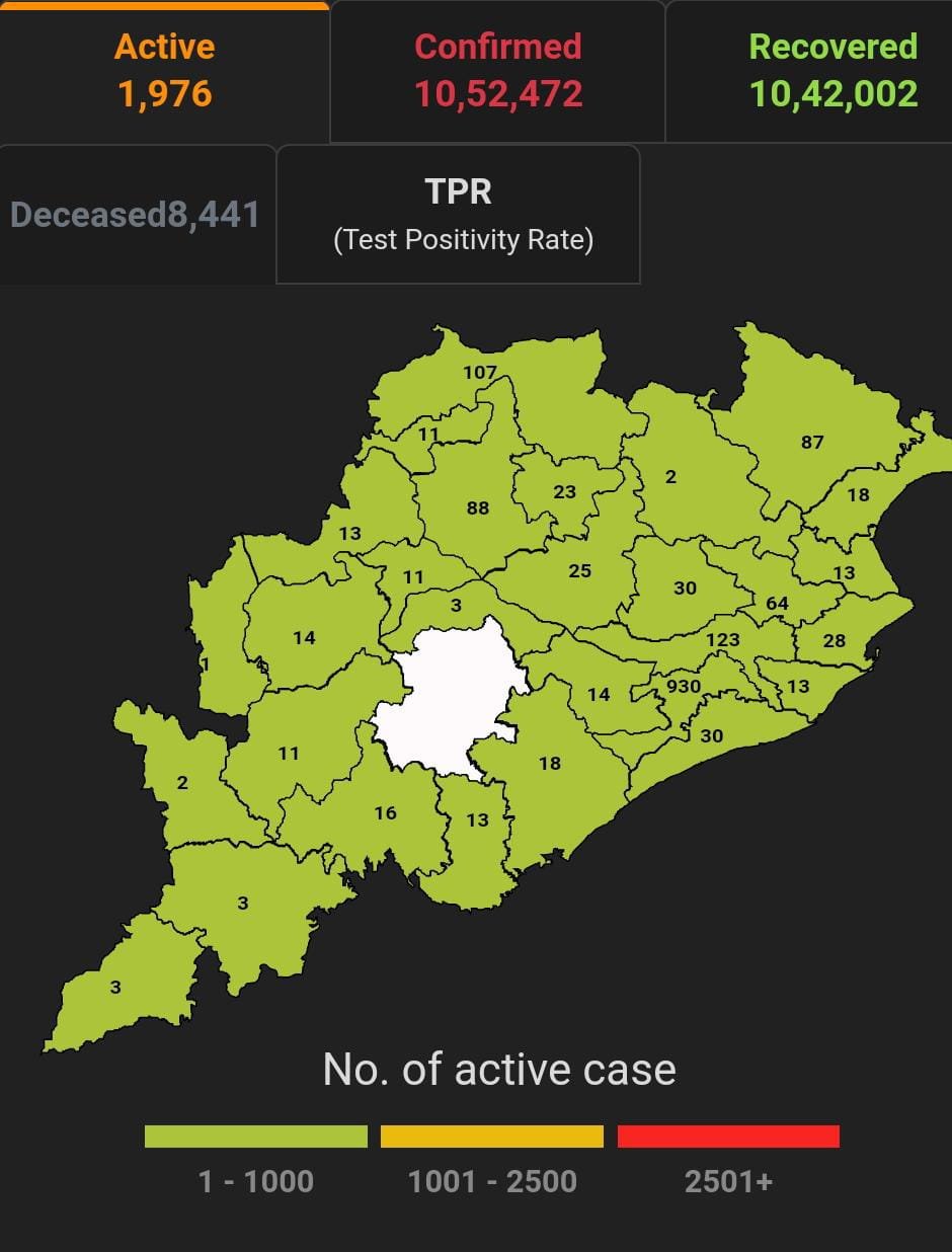 ଭୁବନେଶ୍ବର ୧୭/୧୨(ପିପିଟି); ରାଜ୍ୟରେ ନୂତନ ଆକ୍ରାନ୍ତ ସଂଖ୍ୟା ୧୫୪ ପଜିଟିଭ ସଂଖ୍ୟା ୧୦,୫୨,୪୭୨ ଚିହ୍ନଟ ହୋଇଛନ୍ତି ୧୦,୪୨,୦୦୨ ଜଣ ସୁସ୍ଥ ହୋଇଥିବା ବେଳେ ୧,୯୭୬ ଜଣ ଚିକିତ୍ସିତ ହେଉଛନ୍ତି ଏବଂ ୮୪୪୧ ଜଣଙ୍କର ମୃତ୍ୟୁ ଘଟିଛି ଏବଂ ଅନ୍ଯ ମୃତ୍ୟୁ ୫୩ ହୋଇଛି । ଖୋର୍ଦ୍ଧା ଜିଲ୍ଲାରେ ଆକ୍ରାନ୍ତ ସଂଖ୍ୟା ୧,୮୦,୫୮୫ ସୁସ୍ଥ ସଂଖ୍ୟା ୧,୭୮,୦୫୩ ଚିକିତ୍ସିତ ସଂଖ୍ୟା ୯୩୦, ମୃତ ସଂଖ୍ୟା ୧୫୯୨ କଟକ ଜିଲ୍ଲାରେ ଆକ୍ରାନ୍ତ ସଂଖ୍ୟା ୯୫,୪୧୩, ସୁସ୍ଥ ସଂଖ୍ୟା ୯୪,୪୩୨ଚିକିତ୍ସିତ ସଂଖ୍ୟା ୧୨୩, ମୃତ ସଂଖ୍ୟା ୮୫୮, ଗଞ୍ଜାମ ଜିଲ୍ଲାରେ ଆକ୍ରାନ୍ତ ସଂଖ୍ୟା ୩୩,୯୬୦ ସୁସ୍ଥ ସଂଖ୍ୟା ୩୩,୪୫୩ ଚିକିତ୍ସିତ ସଂଖ୍ୟା ୧୮ ମୃତ ସଂଖ୍ୟା ୪୮୧, ସୁନ୍ଦରଗଡ ଜିଲ୍ଲାରେ ଆକ୍ରାନ୍ତ ସଂଖ୍ୟା ୬୨,୩୧୩ ସୁସ୍ଥ ସଂଖ୍ୟା ୬୧,୬୧୦ ଚିକିତ୍ସିତ ସଂଖ୍ୟା ୧୦୭, ମୃତ ସଂଖ୍ୟା ୫୯୨ ବୋଲି ସ୍ୱାସ୍ଥ୍ୟ ପରିବାର କଲ୍ୟାଣ ବିଭାଗ ତରଫରୁ ଏହି ସୂଚନା ମିଳିଛି।