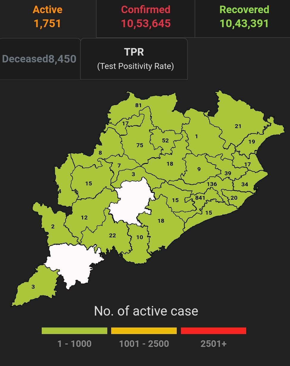 ଭୁବନେଶ୍ବର ୨୪/୧୨(ପିପିଟି); ରାଜ୍ୟରେ ନୂତନ ଆକ୍ରାନ୍ତ ସଂଖ୍ୟା ୧୪୧ ପଜିଟିଭ ସଂଖ୍ୟା ୧୦,୫୩,୬୪୫ ଚିହ୍ନଟ ହୋଇଛନ୍ତି ୧୦,୪୩,୩୯୧ ଜଣ ସୁସ୍ଥ ହୋଇଥିବା ବେଳେ ୧,୭୫୧ ଜଣ ଚିକିତ୍ସିତ ହେଉଛନ୍ତି ଏବଂ ୮୪୫୦ ଜଣଙ୍କର ମୃତ୍ୟୁ ଘଟିଛି ଏବଂ ଅନ୍ଯ ମୃତ୍ୟୁ ୫୩ ହୋଇଛି । ଖୋର୍ଦ୍ଧା ଜିଲ୍ଲାରେ ଆକ୍ରାନ୍ତ ସଂଖ୍ୟା ୧,୮୧,୧୮୭ ସୁସ୍ଥ ସଂଖ୍ୟା ୧,୭୮,୭୪୧ ଚିକିତ୍ସିତ ସଂଖ୍ୟା ୮୪୧, ମୃତ ସଂଖ୍ୟା ୧୫୯୫ କଟକ ଜିଲ୍ଲାରେ ଆକ୍ରାନ୍ତ ସଂଖ୍ୟା ୯୫,୫୦୮, ସୁସ୍ଥ ସଂଖ୍ୟା ୯୪,୫୧୦ ଚିକିତ୍ସିତ ସଂଖ୍ୟା ୧୩୬, ମୃତ ସଂଖ୍ୟା ୮୫୮, ଗଞ୍ଜାମ ଜିଲ୍ଲାରେ ଆକ୍ରାନ୍ତ ସଂଖ୍ୟା ୩୩,୯୭୮ ସୁସ୍ଥ ସଂଖ୍ୟା ୩୩,୪୭୦ ଚିକିତ୍ସିତ ସଂଖ୍ୟା ୧୮ ମୃତ ସଂଖ୍ୟା ।୪୮୨, ସୁନ୍ଦରଗଡ ଜିଲ୍ଲାରେ ଆକ୍ରାନ୍ତ ସଂଖ୍ୟା ୬୨,୩୫୯ ସୁସ୍ଥ ସଂଖ୍ୟା ୬୧,୬୮୨ ଚିକିତ୍ସିତ ସଂଖ୍ୟା ୮୧, ମୃତ ସଂଖ୍ୟା ୫୯୨ ବୋଲି ସ୍ୱାସ୍ଥ୍ୟ ପରିବାର କଲ୍ୟାଣ ବିଭାଗ ତରଫରୁ ଏହି ସୂଚନା ମିଳିଛି।