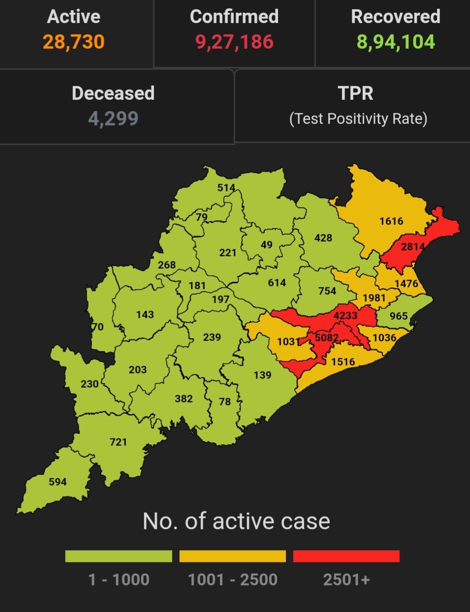 ଭୁବନେଶ୍ବର ୦୬/୦୭(ପିପିଟି); ରାଜ୍ୟରେ ନୂତନ ଆକ୍ରାନ୍ତ ସଂଖ୍ୟା ୨୪୮୭ । ପଜିଟିଭ ସଂଖ୍ୟା ୯,୨୭,୧୮୬ ଚିହ୍ନଟ ହୋଇଛନ୍ତି ୮,୯୪,୧୦୪ ଜଣ ସୁସ୍ଥ ହୋଇଥିବା ବେଳେ ୨୮,୭୩୦ ଜଣ ଚିକିତ୍ସିତ ହେଉଛନ୍ତି ଏବଂ ୪୨୯୯ ଜଣଙ୍କର ମୃତ୍ୟୁ ଘଟିଛି ଏବଂ ଅନ୍ଯ ମୃତ୍ୟୁ ୫୩ ହୋଇଛି । ଖୋର୍ଦ୍ଧା ଜିଲ୍ଲାରେ ଆକ୍ରାନ୍ତ ସଂଖ୍ୟା ୧,୩୮,୩୮୦ ସୁସ୍ଥ ସଂଖ୍ୟା ୧,୩୨,୫୮୮ ଚିକିତ୍ସିତ ସଂଖ୍ୟା ୫,୦୮୨, ମୃତ ସଂଖ୍ୟା ୭୦୦ କଟକ ଜିଲ୍ଲାରେ ଆକ୍ରାନ୍ତ ସଂଖ୍ୟା ୭୯,୪୫୮ ସୁସ୍ଥ ସଂଖ୍ୟା ୭୪,୯୨୧ ଚିକିତ୍ସିତ ସଂଖ୍ୟା ୪,୨୩୩, ମୃତ ସଂଖ୍ୟା ୩୦୦, ଗଞ୍ଜାମ ଜିଲ୍ଲାରେ ଆକ୍ରାନ୍ତ ସଂଖ୍ୟା ୩୩,୧୫୮ ସୁସ୍ଥ ସଂଖ୍ୟା ୩୨,୬୫୬ ଚିକିତ୍ସିତ ସଂଖ୍ୟା ୧୩୯, ମୃତ ସଂଖ୍ୟା ୩୫୫, ସୁନ୍ଦରଗଡ ଜିଲ୍ଲାରେ ଆକ୍ରାନ୍ତ ସଂଖ୍ୟା ୫୯,୪୩୯ ସୁସ୍ଥ ସଂଖ୍ୟା ୫୮,୫୪୬ ଚିକିତ୍ସିତ ସଂଖ୍ୟା ୫୧୪ ,ମୃତ ସଂଖ୍ୟା ୩୭୫ ,ମାଲକାନଗିରି ଜିଲ୍ଲାରେ ଆକ୍ରାନ୍ତ ସଂଖ୍ୟା ୧୦,୯୨୫ ସୁସ୍ଥ ସଂଖ୍ୟା ୧୦,୨୮୮ ଚିକିତ୍ସିତ ସଂଖ୍ୟା ୫୯୪ ,ମୃତ ସଂଖ୍ୟା ୪୦ ବୋଲି ସ୍ୱାସ୍ଥ୍ୟ ପରିବାର କଲ୍ୟାଣ ବିଭାଗ ତରଫରୁ ଏହି ସୂଚନା ମିଳିଛି।