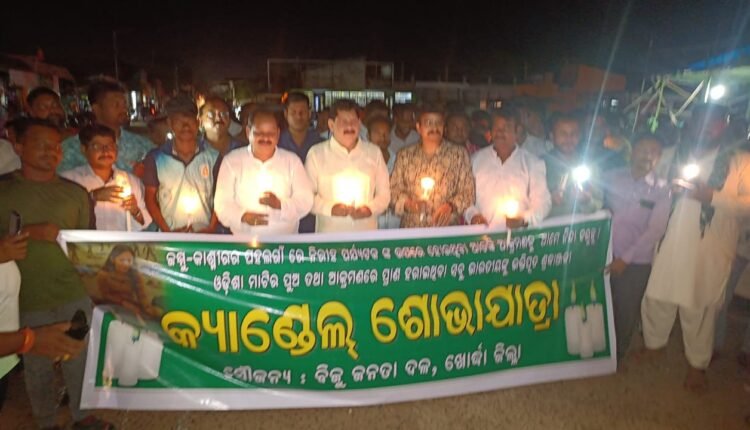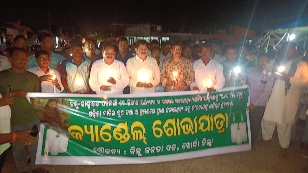ଖୋର୍ଦ୍ଧା,୨୪/୦୪(ପିପିଟି) କାଶ୍ମୀର ପହଲଗାମରେ ହୋଇଥିବା ନିରୀହ ପର୍ଯ୍ୟଟକଙ୍କ ଉପରେ ଆତଙ୍କୀ ଆକ୍ରମଣକୁ ନିନ୍ଦା କରି ଆଜି ବିଜୁ ଜନତା ଦଳ ଖୋର୍ଦ୍ଧା ଜିଲ୍ଲା ତରଫରୁ ଏକ ମହମବତୀ ଶୋଭାଯାତ୍ରା ଖୋର୍ଦ୍ଧା ନୂଆ ବସଷ୍ଟାଣ୍ଡ ଠାରୁ ବାହାରି ପୁରୁଣା ବସଷ୍ଟାଣ୍ଡ ଛକ ଦେଇ ନୟାଗଡ଼ ରୋଡ ସ୍ଥିତ ତାରିଣୀ ମନ୍ଦିର ପର୍ଯ୍ୟନ୍ତ ଆସିଥିଲା ଏହି ଶୋଭାଯାତ୍ରାରେ ବହୁ ହିନ୍ଦୁ,ମୁସଲିମ ଭାଇ ମାନେ ଯୋଗଦେଇ ଆତଙ୍କବାଦ ବିରୋଧୀ ନାରା ଦେଇଥିଲେ । ଖୋର୍ଦ୍ଧା ର ପୂର୍ବତନ ବିଧାୟକ ଶ୍ରୀଯୁକ୍ତ ରାଜେନ୍ଦ୍ର କୁମାର ସାହୁ ଙ୍କ ଆହ୍ବାନ ରେ ତିନିଶହ ରୁ ଉର୍ଦ୍ଧ ଲୋକ ଯୋଗ ଦେଇଥିବା ବେଳେ ଭୁବନେଶ୍ୱର ବିଜୁ ଜନତା ଦଳ ପ୍ରାର୍ଥୀ କ୍ୟାପଟେନ ମନ୍ମଥ ରାଉତରାୟ,ବେଗୁନିଆ ବିଧାୟକ ଶ୍ରୀଯୁକ୍ତ ପ୍ରଦୀପ କୁମାର ସାହୁ,ଜିଲ୍ଲା ପରିଷଦ ସଭ୍ୟ,ସରପଞ୍ଚ,ସମିତିସଭ୍ୟ,ୱାର୍ଡ ମେମ୍ବର,କାଉନସିଲର ମାନେ ଯୋଗ ଦେଇଥିଲେ । ଆତଙ୍କବାଦ ର କୌଣସି ଧର୍ମ ନାହିଁ,ଆମେ ସବୁ ଭାରତୀୟ ଏକ ହୋଇ ଆତଙ୍କବାଦ ବିରୋଧରେ ଲଢ଼ିବାକୁ ହେବ ବୋଲି ମନ୍ମଥ ରାଉତରାୟ ନିଜ ମତ ରଖିଥିଲେ । ବେଗୁନିଆ ବିଧାୟକ ପ୍ରଦୀପ ସାହୁ ଉପସ୍ଥିତ ରହି ଓଡ଼ିଆ ପୁଅ ପ୍ରଶାନ୍ତ ଶତପଥୀ ଙ୍କ ଆତ୍ମା ର ସଦ୍ଗତି କାମନା କରିଥିଲେ । ରାଜେନ୍ଦ୍ର କୁମାର ସାହୁ ଭାରତ ସରକାର ଆତଙ୍କବାଦ ବିରୋଧରେ ସଠିକ୍ କାର୍ଯ୍ୟାନୁଷ୍ଠାନ ଦାବି କରିଥିଲେ । ଅନ୍ୟମାନଙ୍କ ମଧ୍ୟରେ ଅବ୍ୟକ୍ତ ହରିହର ଖାଡଙ୍ଗା,ଶୁଭକାନ୍ତ ମହାପାତ୍ର,ଜନାର୍ଦ୍ଦନ ପ୍ରଧାନ,ଅମିୟ ମହାନ୍ତି,ବିରଞ୍ଚି ନାରାୟଣ ଜେନା,ସତ୍ୟପ୍ରକାଶ ସାହୁ,ବ୍ରହ୍ମାନନ୍ଦ ଜେନା ପ୍ରମୁଖ ଏହି ଶୋଭାଯାତ୍ରା ର ସଂଯୋଜନା କରିଥିଲେ । ଶ୍ରୀ ସାହୁ ଓଡ଼ିଶା ମାଟିର ପୁଅ ତଥା ଆକ୍ରମଣରେ ପ୍ରାଣ ହରାଇଥିବା ସମସ୍ତ ଭାରତୀୟଙ୍କୁ ଭକ୍ତିପୂତ ଶ୍ରଦ୍ଧାଞ୍ଜଳୀ ଅର୍ପଣ କରିଥିଲେ ।