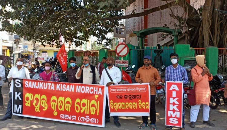 ବ୍ରହ୍ମପୁର,୩୧/୦୧(ପିପିଟି): ସଂଯୁକ୍ତ କୃଷକ ମୋର୍ଚ୍ଚା ଗଞ୍ଜାମ ଜିଲ୍ଲା ପକ୍ଷରୁ ଆଜି ବ୍ରହ୍ମପୁର ପୁରୁଣା ବସଷ୍ଟାଣ୍ଡ ଠାରେ ଦେଶର ଅନ୍ନଦାତାଙ୍କୁ କେନ୍ଦ୍ର ଓ ରାଜ୍ୟ ସରକାର ଦେଇଥିବା ପ୍ରତିଶୃତି ରକ୍ଷା କରିବା ବଦଳରେ ପ୍ରତାରଣା କରିଥିବା ଯୋଗୁଁ ୩୧ ଜାନୁଆରୀ ବିଶ୍ବାସଘାତକତା ଦିବସ ଦେଶବ୍ୟାପୀ ପାଳନ କରିବା ଅବସରରେ ପ୍ରତିବାଦ ସଭା କରିବା ସହ ଦକ୍ଷିଣାଞ୍ଚଳ ରାଜସ୍ବ କମିଶନର, ବ୍ରହ୍ମପୁରଙ୍କ ଜରିଆରେ ମହାମହିମ ରାଷ୍ଟ୍ରପତିଙ୍କୁ ଏକ ସ୍ମାରକପତ୍ର ପ୍ରଦାନ କରାଯାଇଛି । “ସଂଯୁକ୍ତ କିଷାନ ମୋର୍ଚ୍ଚା”ର ନେତୃତ୍ୱରେ ଦେଶର କୃଷକମାନେ କେନ୍ଦ୍ର ସରକାରଙ୍କ କୃଷକ ବିରୋଧୀ ତଥା ଜନ ବିରୋଧୀ ଆଇନକୁ ରଦ୍ଦ କରିବା ସହ ସର୍ବନିମ୍ନ ସହାୟତା ମୂଲ୍ୟର (MSP)ଆଇନଗତ ଗ୍ୟାରେଣ୍ଟି ତଥା କୃଷକ ବିରୋଧୀ ନୀତିର ଏକ ଅପ୍ରତ୍ୟାଶିତ ଆନ୍ଦୋଳନ ଆରମ୍ଭ କରିଥିଲେ। ଏହି ଜନ ଆନ୍ଦୋଳନ ଫଳରେ ଉକ୍ତ ତିନୋଟି କୃଷକ ବିରୋଧୀ କୃଷିନୀତି ରଦ୍ଦ ହେଲା । ସଂଯୁକ୍ତ କିଷାନ ମୋର୍ଚ୍ଚା ୨୧ ନଭେମ୍ବର, ୨୦୨୧ରେ ପ୍ରଧାନମନ୍ତ୍ରୀଙ୍କୁ ଏକ ଚିଠି ଲେଖି ଛଅଗୋଟି ଉଲ୍ଲେଖନୀୟ ପ୍ରସଙ୍ଗ ପ୍ରତି ଧ୍ୟାନ ଆକର୍ଷଣ କରିଥିଲେ। ଏହାର ଜବାବରେ କୃଷି ଓ କୃଷକ କଲ୍ୟାଣ ମନ୍ତ୍ରଣାଳୟର ସଚିବ ସଞ୍ଜୟ ଅଗ୍ରୱାଲ ୯ ଡିସେମ୍ବର ୨୦୨୧ ରେ ସଂଯୁକ୍ତ କିସାନ୍ ମୋର୍ଚ୍ଚାକୁ ଏକ ଚିଠି (ସଚିବ / AFW / 2021 / Misc / 1) ଲେଖିଥିଲେ, ଯେଉଁଥିରେ ସେ ଆଶ୍ୱାସନା ଦେଇଥିଲେ ଯେ,ଏହି ସମସ୍ତ ପ୍ରସଙ୍ଗରେ ସରକାର ଗମ୍ଭୀରତାର ସହ ବିଚାର କରି ସମସ୍ତ କୃଷକ ବିରୋଧୀ ଆଇନକୁ ରଦ୍ଦ କରାଯାଉଛି ଏଣୁ ଆନ୍ଦୋଳନ ପ୍ରତ୍ୟାହାର କରିବାକୁ ଅନୁରୋଧ କରିଥିଲେ। ଏହି ଚିଠି ଉପରେ ନିର୍ଭର କରି ସଂଯୁକ୍ତ କିଷାନ୍ ମୋର୍ଚ୍ଚା ଡିସେମ୍ବର ୧୧ରୁ ଦିଲ୍ଲୀ ସୀମାରେ ଥିବା ସମସ୍ତ ପିକେଟିଂ ପ୍ରଦର୍ଶନକୁ ଉଠାଇବାକୁ ନିଷ୍ପତ୍ତି ନେଇଥିଲେ ।