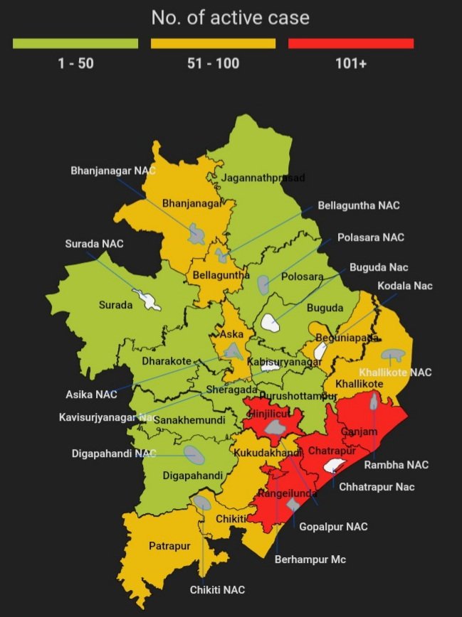 ବ୍ରହ୍ମପୁର,ତା-୧୯/୧୧(ପିପିଟି); ରାଜ୍ୟରେ ଆକ୍ରାନ୍ତଙ୍କ ସଂଖ୍ୟା ୩,୧୧,୭୮୮ ରେ ପହଞ୍ଚିଛି, ସୁସ୍ଥ ସଂଖ୍ୟା ୩,୦୧,୭୭୭, ଚିକିତ୍ସିତ ସଂଖ୍ୟା ୮,୩୬୬, ମୃତ ସଂଖ୍ୟା ୧,୫୯୨ ଓ ଅନ୍ଯ ମୃତ ସଂଖ୍ୟା ୫୩ । ନୂତନ ଆକ୍ରାନ୍ତ ୧୧ ସହ ଗଞ୍ଜାମ ଜିଲ୍ଲାରେ ଆକ୍ରାନ୍ତ ସଂଖ୍ୟା ୨୧,୫୨୮, ସୁସ୍ଥ ସଂଖ୍ୟା ୨୧,୨୦୬, ଚିକିତ୍ସିତ ସଂଖ୍ୟା ୮୦ ଏବଂ ମୃତ ସଂଖ୍ୟା ୨୩୪ ଏବଂ ଅନ୍ୟ ମୃତ ସଂଖ୍ୟା ୦୮ । ରାଜ୍ୟରେ ନୂତନ ସଂକ୍ରମିତ ସଂଖ୍ୟା ୮୬୮ ହୋଇଥିବା ବେଳେ ଗଞ୍ଜାମ ଜିଲ୍ଲାରେ ନୂତନ ସଂକ୍ରମିତ ସଂଖ୍ୟା ୧୧ ବୋଲି ଜଣାପଡିଛି ।