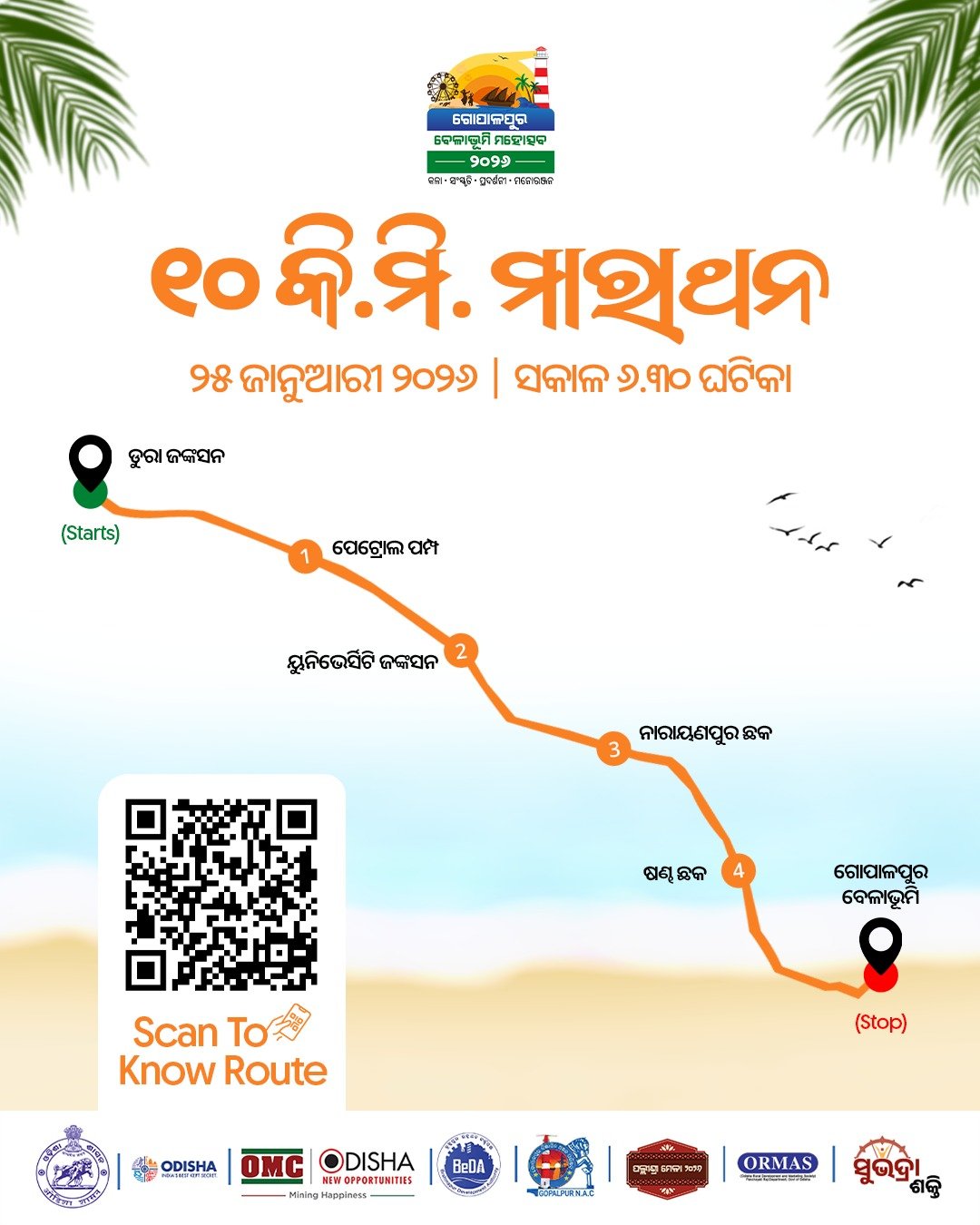 ଗୋପାଳପୁର,୨୪/୦୧(ପିପିଟି):ଗୋପାଳପୁର ବେଳାଭୂମି ମହୋତ୍ସବର ଅବ୍ୟବହିତ ପୂର୍ବରୁ ଅର୍ଥାତ ଆସନ୍ତାକାଲି ୨୫ ତାରିଖ (ରବିବାର) ଆୟୋଜିତ ହେବାକୁ ଥିବା ମେଗା ମାରାଥନ୍କୁ ଦୃଷ୍ଟିରେ ରଖି,କାର୍ଯ୍ୟକ୍ରମର ସଫଳ ଆୟୋଜନ ଏବଂ ଅଂଶଗ୍ରହଣକାରୀ ଧାବକମାନଙ୍କ ସୁରକ୍ଷା ପାଇଁ ଯାତାୟାତ ନିୟନ୍ତ୍ରଣ ଲାଗୁ କରାଯିବ ।