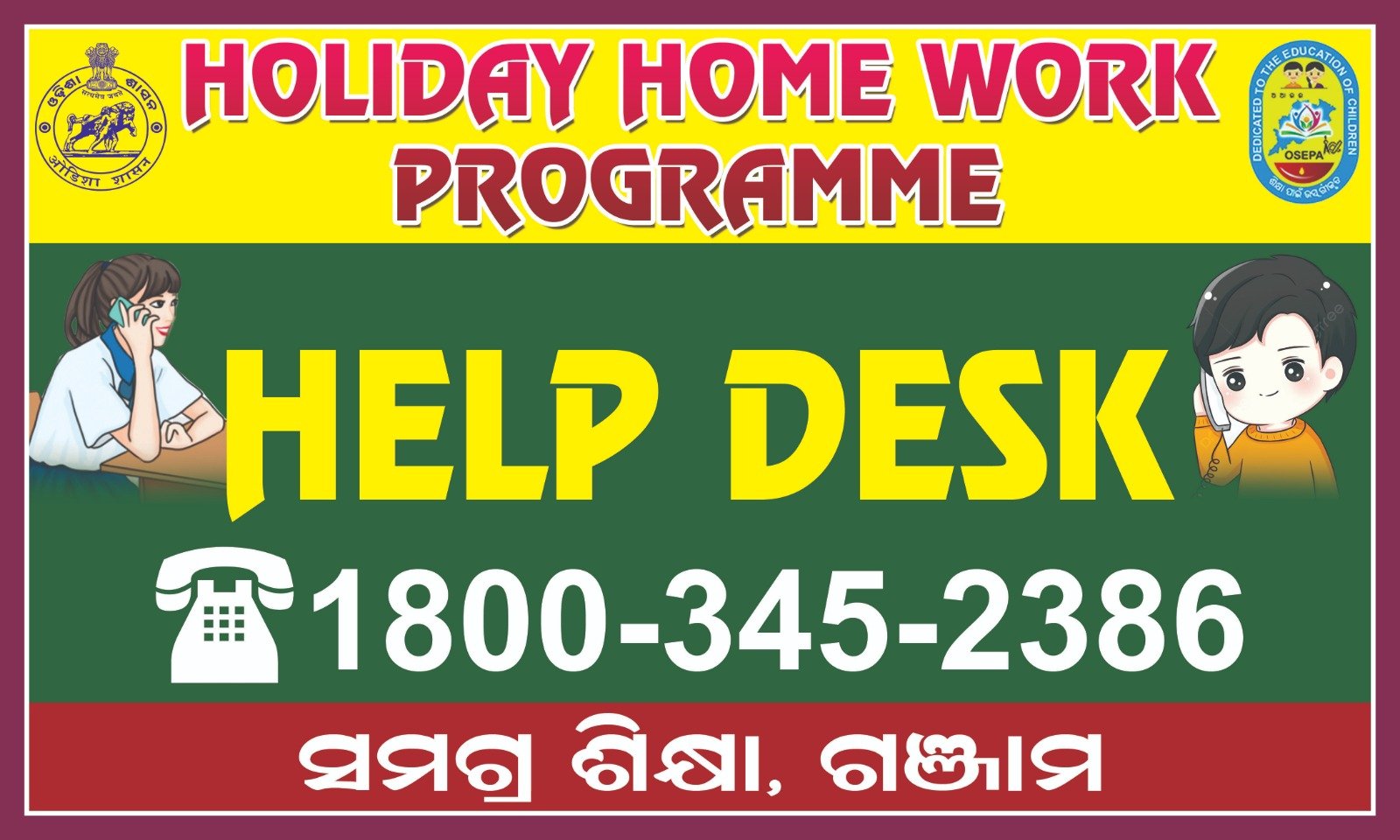 ଏହି କାର୍ଯ୍ୟକ୍ରମର ସଫଳ ରୂପାୟନ ନିମନ୍ତେ ଗଞ୍ଜାମ ଜିଲ୍ଲାପାଳ ଦିବ୍ୟ ଜ୍ୟୋତି ପରିଡ଼ାଙ୍କ ଆଦେଶ ପ୍ରକାରେ ଜିଲ୍ଲାରେ ଦୁଇଗୋଟି ଟୋଲ ଫ୍ରି ନମ୍ବର ଜାରି କରାଯାଇଛି । ଏହାଦ୍ବାରା ଅଭିଭାବକ, ଛାତ୍ର ଛାତ୍ରୀ ଏବଂ ଶିକ୍ଷକଗଣ ଦୈନନ୍ଦିନ କାର୍ଯ୍ୟକ୍ରମ ଗୁଡ଼ିକ ତଦାରଖ କରିପାରିବେ । ଆସନ୍ତା କାଲି ସୋମବାର ୧ ତାରିଖରୁ ସକାଳ ୬ ଘଟିକା ଠାରୁ ସନ୍ଧ୍ୟା ୬ ଘଣ୍ଟା ପର୍ଯ୍ୟନ୍ତ କାର୍ଯ୍ୟକ୍ରମ ସମ୍ପର୍କିତ ତଥ୍ୟ ସମ୍ପର୍କରେ ଅବଗତ ହୋଇ ପାରିବେ । ଗଞ୍ଜାମ ଜିଲ୍ଲାର ଆସିକା, ବେଗୁନିଆପଡା, ବେଳଗୁଣ୍ଠା, ଭଞ୍ଜନଗର, ବୁଗୁଡା, ଛତ୍ରପୁର,ଚିକିଟି,ଧରକୋଟ,ଦିଗପହଣ୍ଡି, ଗଞ୍ଜାମ ଏବଂ ହିଞ୍ଜିଳିକାଟୁ ବ୍ଲକ ଏହିଭଳି ୧୧ ଗୋଟି ବ୍ଲକ ନିମନ୍ତେ ୧୮୦୦-୩୪୫-୨୩୮୫ ଜାରି କରାଯାଇଛି । ସେହିପରି ଜଗନ୍ନାଥ ପ୍ରସାଦ, କବିସୂର୍ଯ୍ୟନଗର,ଖଲ୍ଲିକୋଟ,କୁକୁଡାଖଣ୍ଡି,ପାତ୍ରପୁର, ପୋଲସରା,ପୁରୁଷୋତ୍ତମପୁର, ରଙ୍ଗେଇଲୁଣ୍ଡା,ସାନଖେମୁଣ୍ଡି,ଶେରଗଡ,ସୋରଡା ଏବଂ ବ୍ରହ୍ମପୁର ମହାନଗର ନିଗମ ଅଞ୍ଚଳ ସକାଶେ ୧୮୦୦- ୩୪୫-୨୩୮୬ ଟୋଲ ଫ୍ରି ନମ୍ବର ଜାରି କରାଯାଇଛି ।