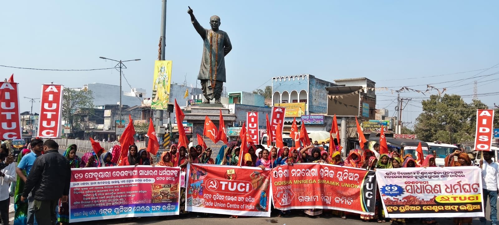ହିଞ୍ଜିଳିକାଟୁ,୧୨/୦୨(ପିପିଟି): ଟ୍ରେଡ ୟୁନିଅନ ସେଣ୍ଟର ଅଫ୍ ଇଣ୍ଡିଆ ଗଞ୍ଜାମ ଜିଲ୍ଲା କମିଟି ନେତୃତ୍ୱରେ ସର୍ବଭାରତୀୟ ଶ୍ରମିକ ଧର୍ମଘଟକୁ ସଫଳ କରିବା ପାଇଁ ଆଜି ହିଞ୍ଜିଳିକାଟୁ ବ୍ଲକର ଗ୍ରାମାଞ୍ଚଳରରୁ ଶହ ଶହ ମନରେଗା ଶ୍ରମିକ, କୋଠାବାଡ଼ି ଓ ଅନ୍ୟାନ୍ୟ ନିର୍ମାଣ ଶ୍ରମିକ,ଘରୋଇ ମହିଳା ଶ୍ରମିକ ଆଦି ବ୍ଳକ ଛକରେ ଏକାଠି ହୋଇଥିଲେ। ଶ୍ରମିକ ବିରୋଧୀ ୪ ଶ୍ରମ ସଂହିତା ପ୍ରତ୍ୟାହାର ଏବଂ ଭିଭିଜିରାମ ବଦଳରେ ମନରେଗା ଆଇନକୁ ପୁନଃ ସ୍ଥାପନା କରିବା, ସମସ୍ତଙ୍କ ହାତକୁ କାମ,ସର୍ବନିମ୍ନ ମଜୁରୀ ଆଇନକୁ କଡ଼ାକଡ଼ି ପାଳନ କରିବା, ୮ ଘଣ୍ଟା କାର୍ଯ୍ୟ ଦିବସକୁ ସୁନିଶ୍ଚିତ କରିବା, ଠିକା ଓ ଚୁକ୍ତି ଭିତ୍ତିକ ନିଯୁକ୍ତି ରଦ୍ଦ କରି ସ୍ଥାୟୀ ନିଯୁକ୍ତି, ମନରେଗା ଶ୍ରମିକଙ୍କ ହରିଲୁଟ୍ ହେଉଥିବା ମଜୁରୀ ଶ୍ରମିକଙ୍କୁ ପ୍ରଦାନ କରିବା, ଶ୍ରମିକ କର୍ମଚାରୀ ମାନଙ୍କର ୧୪ ଦଫା ଦାବିକୁ ମାନିନେବା, ଦୈନିକ ସର୍ବନିମ୍ନ ମଜୁରୀ ୧୦୦୦ ଟଙ୍କା କୁ ବୃଦ୍ଧି କରିବା, ବିଦ୍ୟୁତ ବିଲ୍ ୨୦୨୫ କୁ ପ୍ରତ୍ୟାହାର କରିବା, ଗିଗ ଓ୍ବାର୍କରଙ୍କୁ ଶ୍ରମିକ ମାନ୍ୟତା ଓ ସମସ୍ତ ସାମାଜିକ ସୁରକ୍ଷା, ରାଜ୍ୟର ସମସ୍ତ ନିର୍ମାଣ ଓ ଅସଂଗଠିତ ଶ୍ରମିକଙ୍କ ପଞ୍ଜୀକରଣ ଓ ସାମାଜିକ ସୁରକ୍ଷା,ସମାନ କାମକୁ ସମାନ ମଜୁରୀ,ଶ୍ରମିକ ସ୍ୱାର୍ଥରକ୍ଷା ଦିଗରେ ପେନସନ ସ୍କିମ,ଚାଷୀ ଓ ବିଦ୍ୟୁତ ଉପଭୋକ୍ତାଙ୍କ କଷ୍ଟାର୍ଜିତ ଟଙ୍କାକୁ ହରିଲୁଟ୍ କରୁଥିବା ସ୍ମାର୍ଟ ମିଟର ବସାଇବା ବନ୍ଦ କରିବା,ସର୍ବନିମ୍ନ ପେନସନ ମାସିକ ୧୦ ହଜାର ଟଙ୍କାକୁ ବୃଦ୍ଧି, ସମସ୍ତ ବେକାରୀଙ୍କୁ ନିଯୁକ୍ତି ନହେଲେ ବେକାରୀ ଭତ୍ତା ଆଦି,ଭତ୍ତା ପ୍ରଦାନରେ ଟାଳଟୁଳ ନୀତିକୁ ତୁରନ୍ତ ବନ୍ଦ କରିବା,କୋଠାବାଡ଼ି ଓ ଅନ୍ୟାନ୍ୟ ନିର୍ମାଣ ଶ୍ରମିକଙ୍କ ବେନିଫିଟ ଆବେଦନ ର ୨ ମାସରେ ପ୍ରଦାନ କର, କୃଷକ ବିରୋଧୀ ଓ ଦେଶ ବିରୋଧୀ ଆମେରିକା ଅନ୍ତରୀଣ ଚୁକ୍ତିକୁ ରଦ୍ଦ କରିବା ଆଦି ସ୍ଳୋଗାନ ଦେଇ ତହସିଲ, ବ୍ଳକ,ରାଷ୍ଟ୍ରାୟତ ବ୍ୟାଙ୍କ,ଦୋକାନ ବଜାର, ଅଫିସ,ଦପ୍ତର, ସ୍କୁଲ, କଲେଜ ଆଦି ବନ୍ଦ କରିବା ସହ ରାସ୍ତା ଅବରୋଧ କରିଥିଲେ। ଆମେରିକା ସାମ୍ରାଜ୍ୟବାଦର ଦଲାଲ,କର୍ପୋରେଟ ଦଲାଲ ମୋଦି ସରକାରଙ୍କ ଶ୍ରମିକ, କୃଷକ ବିରୋଧୀ ନୀତିକୁ ତୀବ୍ର ସମାଲୋଚନା କରିବା ସହ ମନରେଗା ଆଇନକୁ ଧ୍ବଂସ କରି ଗ୍ରାମୀଣ ଭାରତର ବିକାଶକୁ ଅବରୋଧ କରିବା ପାଇଁ ମୋଦୀ ସରକାରଙ୍କ ଷଡଯନ୍ତ୍ରକୁ ଏ ଦେଶର ଶ୍ରମିକ,କର୍ମଚାରୀ କୃଷକ ବନ୍ଧୁ ବରଦାସ୍ତ କରିବେ ନାହିଁ ବୋଲି ଜଣାଇଥିଲେ। ଶ୍ରମଜୀବୀ ଜନଗଣଙ୍କ ଅଧିକାରକୁ ସାବ୍ୟସ୍ତ କରିବା ପାଇଁ ସମସ୍ତଙ୍କ ଏକତା ଓ ଦୁର୍ବାର ଆନ୍ଦୋଳନ ଆବଶ୍ୟକ ଯେପରିକି ପୁଞ୍ଜିବାଦର ପତନ ହୋଇ ଶ୍ରମଜୀବୀ ଜନଗଣଙ୍କ ବିଜୟ ସେଥିପାଇଁ ସମସ୍ତ ଶ୍ରମିକ ସଂଗଠନ, କୃଷକ ସଂଗଠନ, ପ୍ରଗତିଶୀଳ ସଂଗଠନ ଏବଂ ଗଣତାନ୍ତ୍ରିକ ଶକ୍ତି ଆଗେଇ ଆସିବାକୁ ଆହ୍ୱାନ ଦେଇଥିଲେ। AIUTUC ନିମାଇଁ ଚରଣ ସାହୁ, ପୁପୁନ ସାହୁ, ନାରାୟଣ ସାହୁ, କିଷାନ୍ ସାହୁ, ସାଥି ସୋମନାଥ ବେହେରା ଆଦି ଶ୍ରମିକ ମାରଣ ନୀତିର ତୀବ୍ର ସମାଲୋଚନା କରିଥିଲେ। ଓଡ଼ିଶା ମନରେଗା ଶ୍ରମିକ ୟୁନିଅନର ଯଶୋଦା ନାଇକ, ଓଡ଼ିଶା ନିର୍ମାଣ ଶ୍ରମିକ ୟୁନିଅନର ଶାନ୍ତି ନାଇକ, ଜାମିନି ଦାସ,ସରସ୍ଵତୀ ନାୟକ,ସଂଗ୍ରାମୀ ଶ୍ରମିକ ୟୁନିଅନର ପି ଯୋଗେନ୍ଦ୍ର,ଘରୋଇ ମହିଳା ଶ୍ରମିକ ୟୁନିଅନର ଵିନୋଦିନି ଦାସ,ଏନ୍ ରାଜେଶ୍ଵରି, ରିତା ଦାସ, କ୍ରା