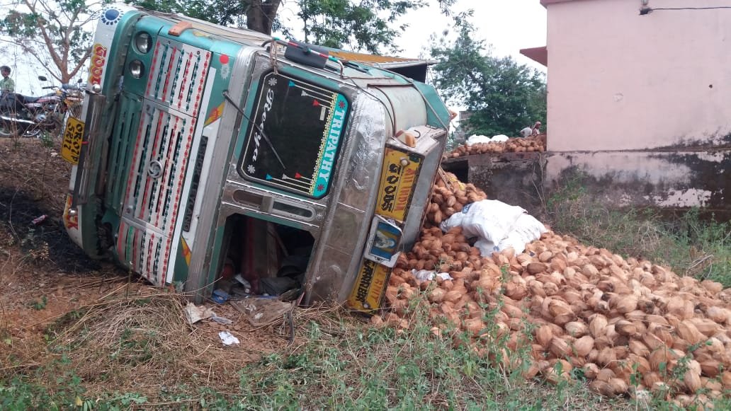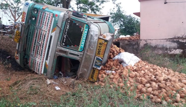 ନଡ଼ିଆ ବୋଝେଇ ଟ୍ରକ ଓଲଟିଲା ।