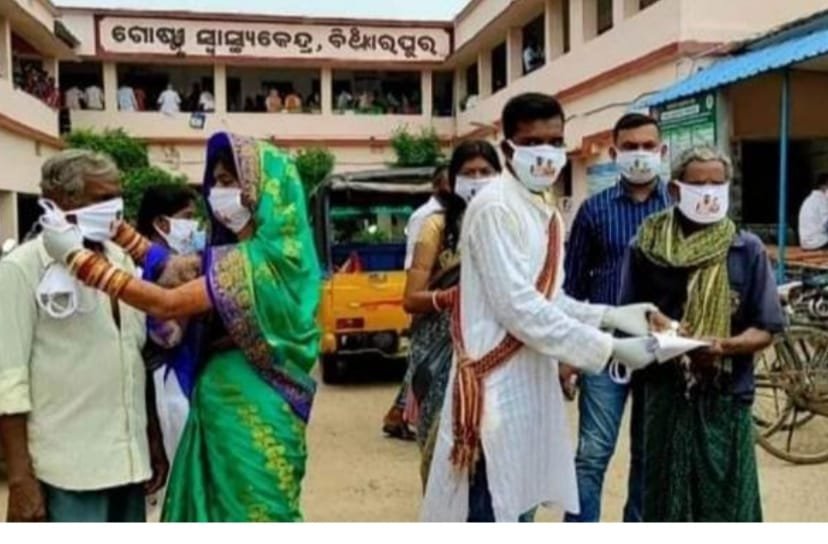 ନବଦମ୍ପତି ବାହାଘର ଭୋଜି ବନ୍ଦ କରି ଲୋକଙ୍କୁ ମାସ୍କ ଓ ସାନିଟାଇଜର ବାଣ୍ଟିବା ସହିତ ଲୋକଙ୍କୁ କରୋନା ସମ୍ପର୍କରେ ସଚେତନ କରିଛନ୍ତି।