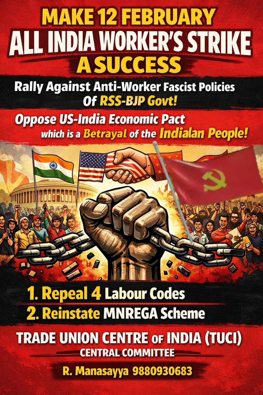 ଏହି କୃଷକ-ଶ୍ରମିକ ବିରୋଧୀ ନୀତି ବିରୋଧରେ ଫେବ୍ରୁଆରି ୧୨ ତାରିଖରେ ସାରା ଦେଶରେ ହେଉଥିବା ଧର୍ମଘଟକୁ ସଫଳ କରିବା ସହ ବିଜେପି ସରକାରଙ୍କ ନୀତି ବିରୁଦ୍ଧରେ ବୃହତ ଜନ ଆନ୍ଦୋଳନରେ ପରିଣତ କରିବା ଏବଂ ବିଜୟ ପର୍ଯ୍ୟନ୍ତ ସଂଗ୍ରାମ ଜାରି ରଖିବା ହେଉଛି ସମୟର ଆହ୍ବାନ । ଶ୍ରମିକ କର୍ମଚାରୀ ବିରୋଧୀ ଆର୍ ଏସ ଏସ ଫାସିବାଦ ଶକ୍ତି ବିରୁଦ୍ଧରେ ସଡ଼କକୁ ଓହ୍ଲାଇ ବିକ୍ଷୋଭ ପ୍ରଦର୍ଶନ କରନ୍ତୁ, ଭାରତୀୟଙ୍କ ପ୍ରତି ବିଶ୍ୱାସଘାତକତା କରି ମୋଦି ସରକାର କରିଥିବା ଭାରତ ଓ ଆମେରିକା ବିବାଦୀୟ ବାଣିଜ୍ୟ ଚୁକ୍ତିନାମାରୁ ତୁରନ୍ତ ଓହରି ଆସିବାକୁ କେନ୍ଦ୍ର ସରକାର ଉପରେ ଚାପ ପ୍ରଦାନ କର, ଶ୍ରମିକ ବିରୋଧୀ ୪ ଶ୍ରମ ସଂହିତା ରଦ୍ଦ କରିବା, ମନରେଗା ଆଇନକୁ ପୁନଃ ସ୍ଥାପିତ କରିବା ଆଦି ଦାବିନେଇ ଏହି ଧର୍ମଘଟରେ ସକ୍ରିୟ ଭାବେ ଅଂଶଗ୍ରହଣ କରିବା ଏବଂ ସରକାରଙ୍କ ଜନବିରୋଧୀ ନୀତିକୁ ଦୃଢ଼ ପ୍ରତିରୋଧ କରିବା ପାଇଁ ଦେଶର ସମସ୍ତ ଶ୍ରମିକ, କୃଷକ, ପ୍ରଗତିଶୀଳ ସଂଗଠନ ଏବଂ ଗଣତାନ୍ତ୍ରିକ ଶକ୍ତିକୁ ଟିୟୁସିଆଇ କେନ୍ଦ୍ରୀୟ କମିଟି ନିବେଦନ କରିଛି।