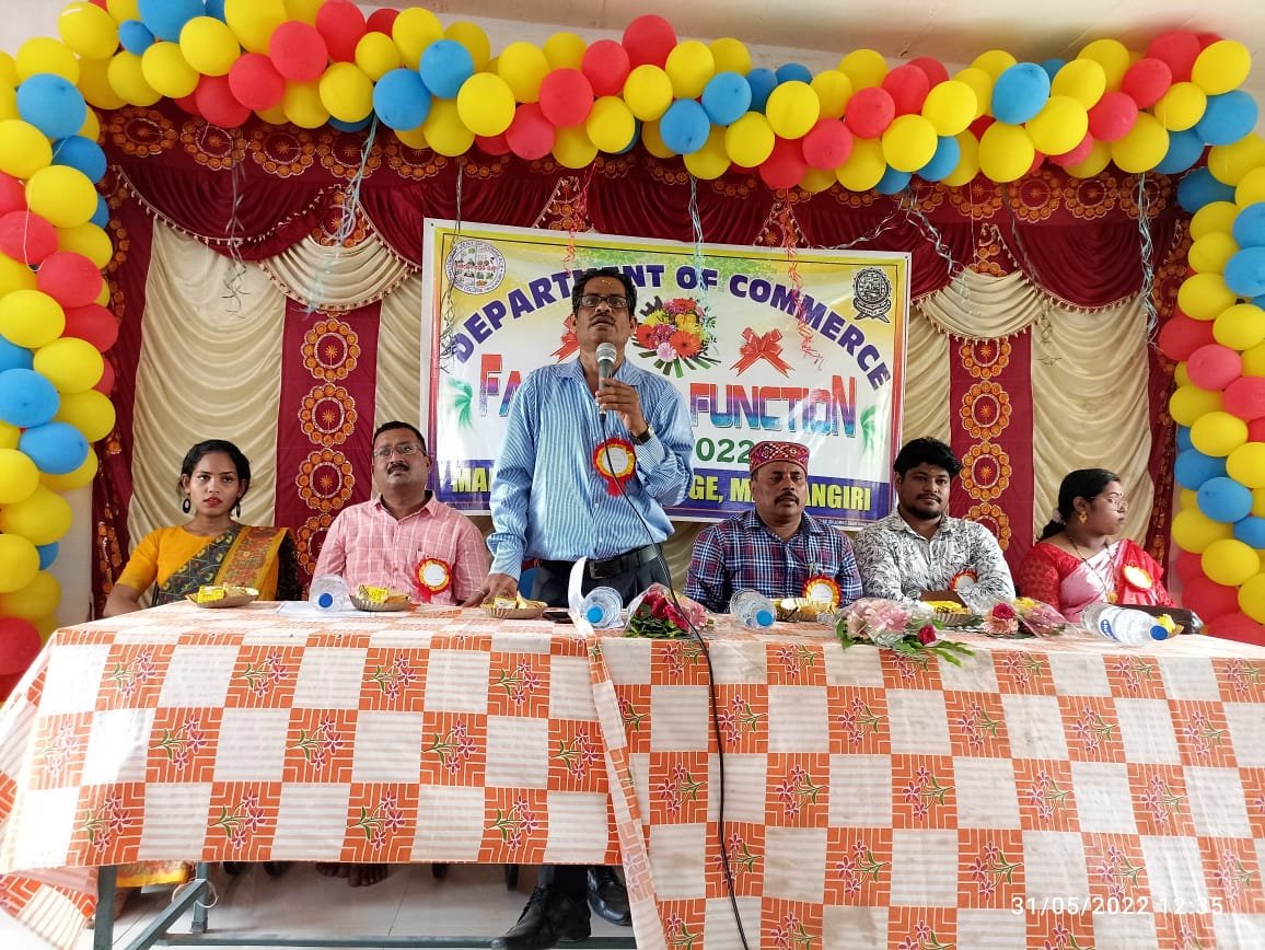 ମାଲକାନଗିରି,୩୧/୦୫(ପିପିଟି): ମାଲକାନଗିରି ମହାବିଦ୍ୟାଳୟ ବାଣିଜ୍ୟ ବିଭାଗ ତରଫ ରୁ +୩ ଛାତ୍ର ଛାତ୍ରୀ ଓ +୨ ଶେଷ ବର୍ଷ ଛାତ୍ର ଛାତ୍ରୀମାନଙ୍କୁ ନେଇ ଏକ ନିରାଡମ୍ବର ପୂର୍ଣ୍ଣ ବିଦାୟ କାଳିନ ସମ୍ବର୍ଦ୍ଧନା ଉତ୍ସବ ପାଳିତ ହୋଇଯାଇଛି । ମୁଖ୍ୟ ଡ. ରଞ୍ଜନ କୁମାର ସ୍ୱାଇଁ ସଭାପତିତ୍ବ କରିଥିବା ବେଳେ ମୁଖ୍ୟ ଅତିଥି ରୂପେ ଅଧ୍ୟକ୍ଷ ଅଶୋକ କୁମାର ଷଡ଼ଙ୍ଗୀ ଯୋଗଦାନ କରି ଛାତ୍ରଛାତ୍ରୀମାନଙ୍କ ଉଜ୍ଜ୍ବଳ ଭବିଷ୍ୟତ କାମନା କରିବା ସହ ଶୁଭ ଆଶୀର୍ବାଦ ପ୍ରଦାନ କରିଥିଲେ । ସମ୍ମାନିତ ଅତିଥି ରୂପେ ବାଣିଜ୍ୟ ବିଭାଗର ପୂର୍ବତନ ଛାତ୍ର ରବି ରାଜେଶ ଉପସ୍ଥିତ ରହି ସାନ ଭାଇ ଭଉଣୀମାନଙ୍କୁ ବଡ ସପ୍ନ ଦେଖିବା ସହ କଠିନ ପରିଶ୍ରମ ବଳରେ ସୁନାଗରିକ ହେବା ପାଇଁ ପରାମର୍ଶ ଦେଇଥିଲେ । ଏହି କାର୍ଯ୍ୟକ୍ରମକୁ ମେଘା ଅଗ୍ରୱାଲ, ଦୀପ୍ତି ରେଖା ମିଶ୍ର, ବି. ଗୁପ୍ତେଶ୍ୱର ରାଓ ଏବଂ ସ୍ନିଗ୍ଧା ସର୍ଦାର ସଫଳ କରିବା ପାଇଁ ସହଯୋଗ କରିଥିଲେ । ଏହି କାର୍ଯ୍ୟକ୍ରମରେ ୧୫୦ରୁ ଊର୍ଦ୍ଧ୍ବ ଛାତ୍ରଛାତ୍ରୀ ଯୋଗଦେଇଥିଲେ । ପ୍ରଥମେ ନୀଳମ ହାଲଦାର, ସୁମନ ରାଠି, ଭି.ନେହା ରାଜୁ, ଗାୟତ୍ରୀ ପାତ୍ର ଏବଂ ମଞ୍ଜୁ ବେହେରା ସ୍ୱାଗତ ସଂଗୀତ ଗାନ କରିଥିଲେ । ପ୍ରଥମେ ବାଣିଜ୍ୟ ବିଭାଗର ଠାକୁର ମା’ ଲଷ୍ମୀଙ୍କ ପ୍ରତିମୂର୍ତ୍ତିରେ ପୁଷ୍ପମାଲ୍ୟ ଅର୍ପଣ କରିବା ସହ ପ୍ରଦୀପ ପ୍ରଜ୍ବଳନ କରିଥିଲେ । ଏହି ଅବସରରେ ଏକ ରଙ୍ଗାରଙ୍ଗ କାର୍ଯ୍ୟକ୍ରମ ଅନୁଷ୍ଠିତ ହୋଇଥିଲା । ଏହି ସଭାରେ ନବ ନିଯୁକ୍ତ ଅଧ୍ଯାପିକା ଆରତୀ ଲୁଗୁନଙ୍କୁ ପୁଷ୍ପ ଗୁଛ ସହିତ ଉତ୍ତରୀୟ ଦେଇ
