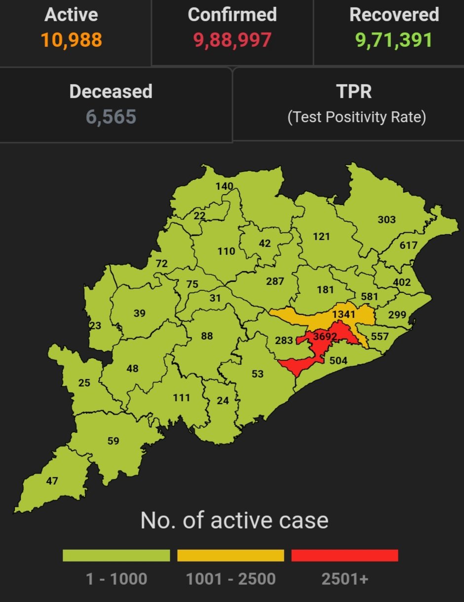 ଭୁବନେଶ୍ବର ୧୦/୦୮(ପିପିଟି); ରାଜ୍ୟରେ ନୂତନ ଆକ୍ରାନ୍ତ ସଂଖ୍ୟା ୧୦୪୧ । ପଜିଟିଭ ସଂଖ୍ୟା ୯,୮୮,୯୯୭ ଚିହ୍ନଟ ହୋଇଛନ୍ତି ୯,୭୧,୩୯୧ ଜଣ ସୁସ୍ଥ ହୋଇଥିବା ବେଳେ ୧୦,୯୮୮ ଜଣ ଚିକିତ୍ସିତ ହେଉଛନ୍ତି ଏବଂ ୬୫୬୫ ଜଣଙ୍କର ମୃତ୍ୟୁ ଘଟିଛି ଏବଂ ଅନ୍ଯ ମୃତ୍ୟୁ ୫୩ ହୋଇଛି । ଖୋର୍ଦ୍ଧା ଜିଲ୍ଲାରେ ଆକ୍ରାନ୍ତ ସଂଖ୍ୟା ୧,୫୩,୬୦୦ ସୁସ୍ଥ ସଂଖ୍ୟା ୧,୪୮,୫୬୩ ଚିକିତ୍ସିତ ସଂଖ୍ୟା ୩,୬୯୨, ମୃତ ସଂଖ୍ୟା ୧୩୩୫ କଟକ ଜିଲ୍ଲାରେ ଆକ୍ରାନ୍ତ ସଂଖ୍ୟା ୮୮,୧୦୨ ସୁସ୍ଥ ସଂଖ୍ୟା ୮୬,୩୧୩ ଚିକିତ୍ସିତ ସଂଖ୍ୟା ୧,୩୪୧, ମୃତ ସଂଖ୍ୟା ୪୪୪, ଗଞ୍ଜାମ ଜିଲ୍ଲାରେ ଆକ୍ରାନ୍ତ ସଂଖ୍ୟା ୩୩,୪୯୬ ସୁସ୍ଥ ସଂଖ୍ୟା ୩୨,୯୭୩ ଚିକିତ୍ସିତ ସଂଖ୍ୟା ୫୩, ମୃତ ସଂଖ୍ୟା ୪୬୨, ସୁନ୍ଦରଗଡ ଜିଲ୍ଲାରେ ଆକ୍ରାନ୍ତ ସଂଖ୍ୟା ୬୦,୮୯୫ ସୁସ୍ଥ ସଂଖ୍ୟା ୬୦,୧୮୫ ଚିକିତ୍ସିତ ସଂଖ୍ୟା ୨୪୦ ,ମୃତ ସଂଖ୍ୟା ୫୬୬, ମାଲକାନଗିରି ଜିଲ୍ଲାରେ ଆକ୍ରାନ୍ତ ସଂଖ୍ୟା ୧୧,୫୧୭ ସୁସ୍ଥ ସଂଖ୍ୟା ୧୧,୪୨୨ ଚିକିତ୍ସିତ ସଂଖ୍ୟା ୫୯ ,ମୃତ ସଂଖ୍ୟା ୪୫ ବୋଲି ସ୍ୱାସ୍ଥ୍ୟ ପରିବାର କଲ୍ୟାଣ ବିଭାଗ ତରଫରୁ ଏହି ସୂଚନା ମିଳିଛି।