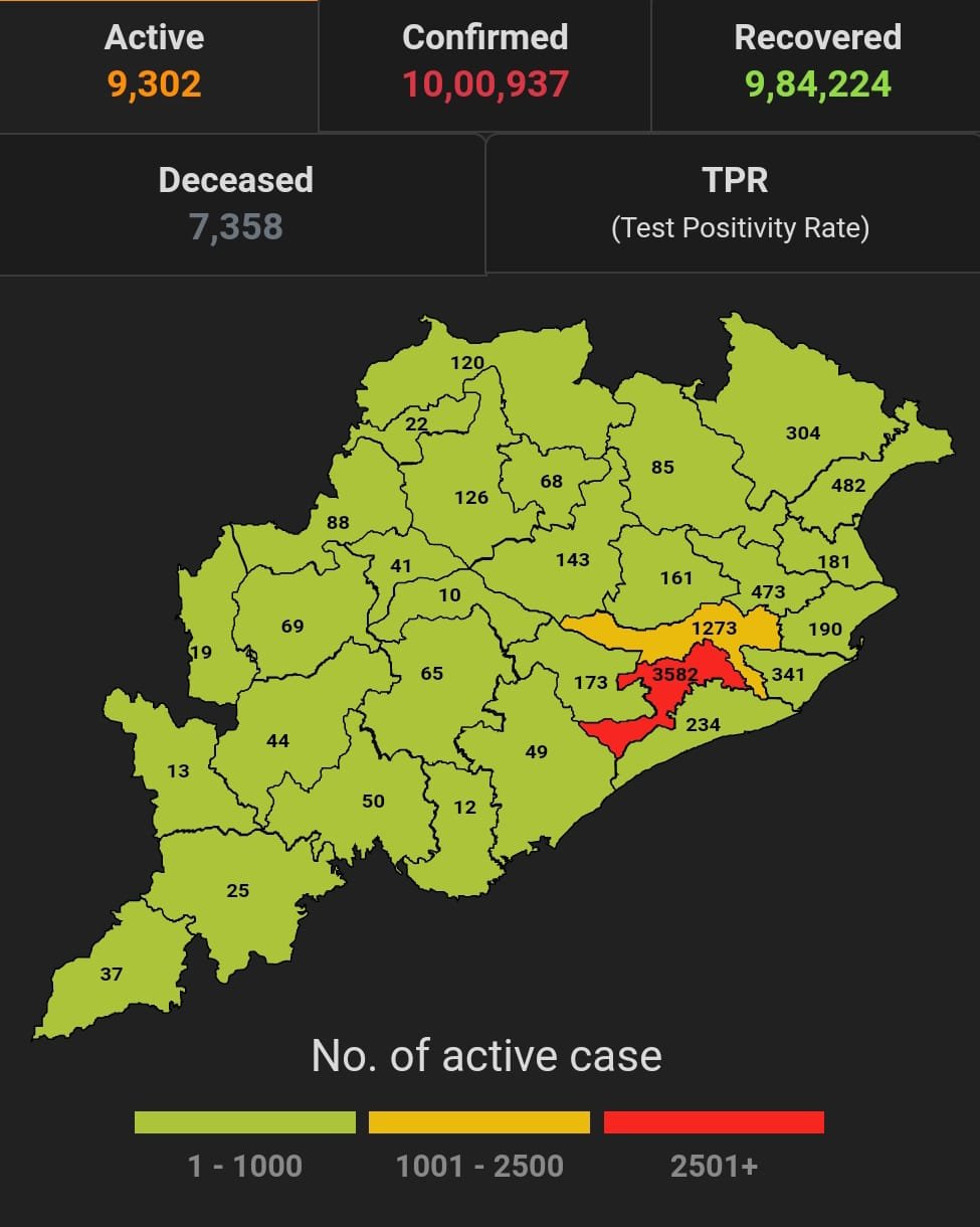 ଭୁବନେଶ୍ବର ୨୨/୦୮(ପିପିଟି); ରାଜ୍ୟରେ ନୂତନ ଆକ୍ରାନ୍ତ ସଂଖ୍ୟା ୮୫୩ । ପଜିଟିଭ ସଂଖ୍ୟା ୧୦,୦୦,୯୩୭ ଚିହ୍ନଟ ହୋଇଛନ୍ତି ୯,୮୪,୨୨୪ ଜଣ ସୁସ୍ଥ ହୋଇଥିବା ବେଳେ ୯,୩୦୨ ଜଣ ଚିକିତ୍ସିତ ହେଉଛନ୍ତି ଏବଂ ୭୩୫୮ ଜଣଙ୍କର ମୃତ୍ୟୁ ଘଟିଛି ଏବଂ ଅନ୍ଯ ମୃତ୍ୟୁ ୫୩ ହୋଇଛି । ଖୋର୍ଦ୍ଧା ଜିଲ୍ଲାରେ ଆକ୍ରାନ୍ତ ସଂଖ୍ୟା ୧,୫୭,୯୪୩ ସୁସ୍ଥ ସଂଖ୍ୟା ୧,୫୨,୯୩୮ ଚିକିତ୍ସିତ ସଂଖ୍ୟା ୩,୫୮୨, ମୃତ ସଂଖ୍ୟା ୧୪୧୩ କଟକ ଜିଲ୍ଲାରେ ଆକ୍ରାନ୍ତ ସଂଖ୍ୟା ୮୯,୭୮୨ ସୁସ୍ଥ ସଂଖ୍ୟା ୮୭,୯୦୪ ଚିକିତ୍ସିତ ସଂଖ୍ୟା ୧,୨୭୩, ମୃତ ସଂଖ୍ୟା ୬୦୧, ଗଞ୍ଜାମ ଜିଲ୍ଲାରେ ଆକ୍ରାନ୍ତ ସଂଖ୍ୟା ୩୩,୫୬୭ ସୁସ୍ଥ ସଂଖ୍ୟା ୩୩,୦୪୩ ଚିକିତ୍ସିତ ସଂଖ୍ୟା ୪୯, ମୃତ ସଂଖ୍ୟା ୪୬୭, ସୁନ୍ଦରଗଡ ଜିଲ୍ଲାରେ ଆକ୍ରାନ୍ତ ସଂଖ୍ୟା ୬୧,୦୪୬ ସୁସ୍ଥ ସଂଖ୍ୟା ୬୦,୩୫୨ ଚିକିତ୍ସିତ ସଂଖ୍ୟା ୧୨୦ ,ମୃତ ସଂଖ୍ୟା ୫୭୦, ମାଲକାନଗିରି ଜିଲ୍ଲାରେ ଆକ୍ରାନ୍ତ ସଂଖ୍ୟା ୧୧,୫୭୩ ସୁସ୍ଥ ସଂଖ୍ୟା ୧୧,୪୮୮ ଚିକିତ୍ସିତ ସଂଖ୍ୟା ୩୭ ,ମୃତ ସଂଖ୍ୟା ୪୫ ବୋଲି ସ୍ୱାସ୍ଥ୍ୟ ପରିବାର କଲ୍ୟାଣ ବିଭାଗ ତରଫରୁ ଏହି ସୂଚନା ମିଳିଛି।