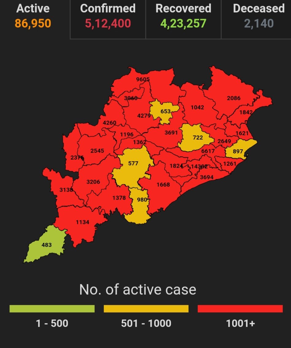 ଭୁବନେଶ୍ବର ୦୭/୦୫(ପିପିଟି); ରାଜ୍ୟରେ ନୂତନ ଆକ୍ରାନ୍ତ ସଂଖ୍ୟା ୧୨୨୩୮। ପଜିଟିଭ ସଂଖ୍ୟା ୫,୧୨,୪୦୦ ଚିହ୍ନଟ ହୋଇଛନ୍ତି ୪,୨୩,୨୫୭ ଜଣ ସୁସ୍ଥ ହୋଇଥିବା ବେଳେ ୮୬,୯୫୦ ଜଣ ଚିକିତ୍ସିତ ହେଉଛନ୍ତି ଏବଂ ୨୧୪୦ ଜଣଙ୍କର ମୃତ୍ୟୁ ଘଟିଛି ଏବଂ ଅନ୍ଯ ମୃତ୍ୟୁ ୫୩ ହୋଇଛି । ଖୋର୍ଦ୍ଧା ଜିଲ୍ଲାରେ ଆକ୍ରାନ୍ତ ସଂଖ୍ୟା ୮୦,୬୩୯ ସୁସ୍ଥ ସଂଖ୍ୟା ୬୫,୯୪୫ ଚିକିତ୍ସିତ ସଂଖ୍ୟା ୧୪,୩୦୨, ମୃତ ସଂଖ୍ୟା ୩୮୨ କଟକ ଜିଲ୍ଲାରେ ଆକ୍ରାନ୍ତ ସଂଖ୍ୟା ୪୦,୩୨୬ ସୁସ୍ଥ ସଂଖ୍ୟା ୩୩,୫୫୭ ଚିକିତ୍ସିତ ସଂଖ୍ୟା ୬୬୧୭, ମୃତ ସଂଖ୍ୟା ୧୪୮, ଗଞ୍ଜାମ ଜିଲ୍ଲାରେ ଆକ୍ରାନ୍ତ ସଂଖ୍ୟା ୨୫,୯୨୫, ସୁସ୍ଥ ସଂଖ୍ୟା ୨୩,୯୮୭ ଚିକିତ୍ସିତ ସଂଖ୍ୟା ୧୬୬୮ ମୃତ ସଂଖ୍ୟା ୨୬୨, ସୁନ୍ଦରଗଡ ଜିଲ୍ଲାରେ ଆକ୍ରାନ୍ତ ସଂଖ୍ୟା ୩୫,୭୨୮ ସୁସ୍ଥ ସଂଖ୍ୟା ୨୫,୯୧୪ ଚିକିତ୍ସିତ ସଂଖ୍ୟା ୭୬୦୫ ମୃତ ସଂଖ୍ୟା ୨୦୫ ବୋଲି ସ୍ୱାସ୍ଥ୍ୟ ପରିବାର କଲ୍ୟାଣ ବିଭାଗ ତରଫରୁ ଏହି ସୂଚନା ମିଳିଛି।