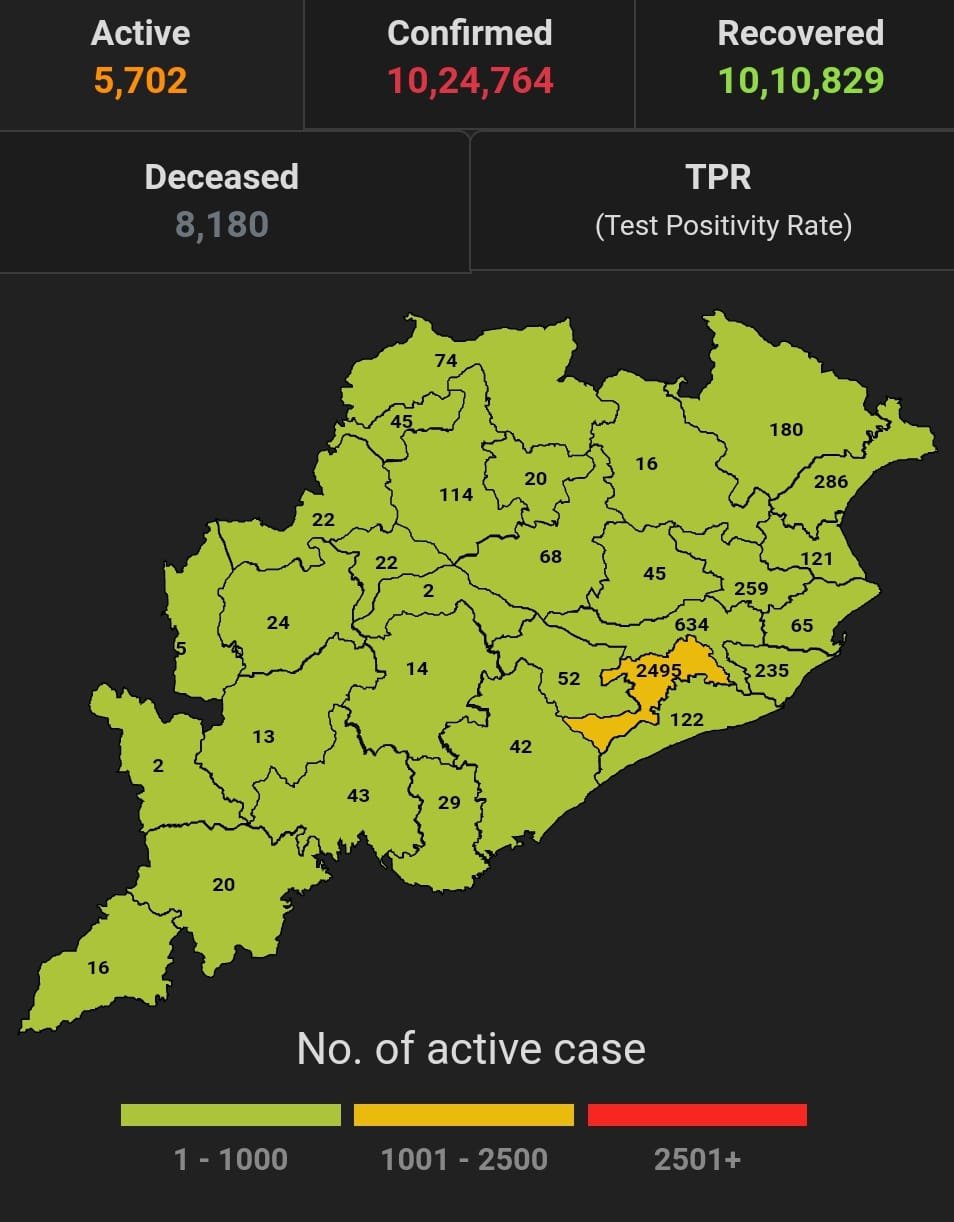 ଭୁବନେଶ୍ବର ୨୭/୦୯(ପିପିଟି); ରାଜ୍ୟରେ ନୂତନ ଆକ୍ରାନ୍ତ ସଂଖ୍ୟା ୪୪୪। ପଜିଟିଭ ସଂଖ୍ୟା ୧୦,୨୪,୭୬୪ ଚିହ୍ନଟ ହୋଇଛନ୍ତି ୧୦,୧୦,୮୨୯ ଜଣ ସୁସ୍ଥ ହୋଇଥିବା ବେଳେ ୫,୭୦୨ ଜଣ ଚିକିତ୍ସିତ ହେଉଛନ୍ତି ଏବଂ ୮୧୮୦ ଜଣଙ୍କର ମୃତ୍ୟୁ ଘଟିଛି ଏବଂ ଅନ୍ଯ ମୃତ୍ୟୁ ୫୩ ହୋଇଛି । ଖୋର୍ଦ୍ଧା ଜିଲ୍ଲାରେ ଆକ୍ରାନ୍ତ ସଂଖ୍ୟା ୧,୬୭,୩୫୭ ସୁସ୍ଥ ସଂଖ୍ୟା ୧,୬୩,୩୬୦ ଚିକିତ୍ସିତ ସଂଖ୍ୟା ୨,୪୯୫, ମୃତ ସଂଖ୍ୟା ୧୪୯୪ କଟକ ଜିଲ୍ଲାରେ ଆକ୍ରାନ୍ତ ସଂଖ୍ୟା ୯୨,୮୫୩, ସୁସ୍ଥ ସଂଖ୍ୟା ୯୧,୩୮୧ ଚିକିତ୍ସିତ ସଂଖ୍ୟା ୬୩୪, ମୃତ ସଂଖ୍ୟା ୮୩୪, ଗଞ୍ଜାମ ଜିଲ୍ଲାରେ ଆକ୍ରାନ୍ତ ସଂଖ୍ୟା ୩୩,୭୪୬ ସୁସ୍ଥ ସଂଖ୍ୟା ୩୩,୨୨୩ ଚିକିତ୍ସିତ ସଂଖ୍ୟା ୪୨ ମୃତ ସଂଖ୍ୟା ୪୭୩, ସୁନ୍ଦରଗଡ ଜିଲ୍ଲାରେ ଆକ୍ରାନ୍ତ ସଂଖ୍ୟା ୬୧,୫୩୦ ସୁସ୍ଥ ସଂଖ୍ୟା ୬୦,୮୭୩ ଚିକିତ୍ସିତ ସଂଖ୍ୟା ୭୪ ,ମୃତ ସଂଖ୍ୟା ୫୭୯, ମାଲକାନଗିରି ଜିଲ୍ଲାରେ ଆକ୍ରାନ୍ତ ସଂଖ୍ୟା ୧୧,୬୫୩ ସୁସ୍ଥ ସଂଖ୍ୟା ୧୧,୫୮୮ ଚିକିତ୍ସିତ ସଂଖ୍ୟା ୧୬,ମୃତ ସଂଖ୍ୟା ୪୬ ବୋଲି ସ୍ୱାସ୍ଥ୍ୟ ପରିବାର କଲ୍ୟାଣ ବିଭାଗ ତରଫରୁ ଏହି ସୂଚନା ମିଳିଛି।