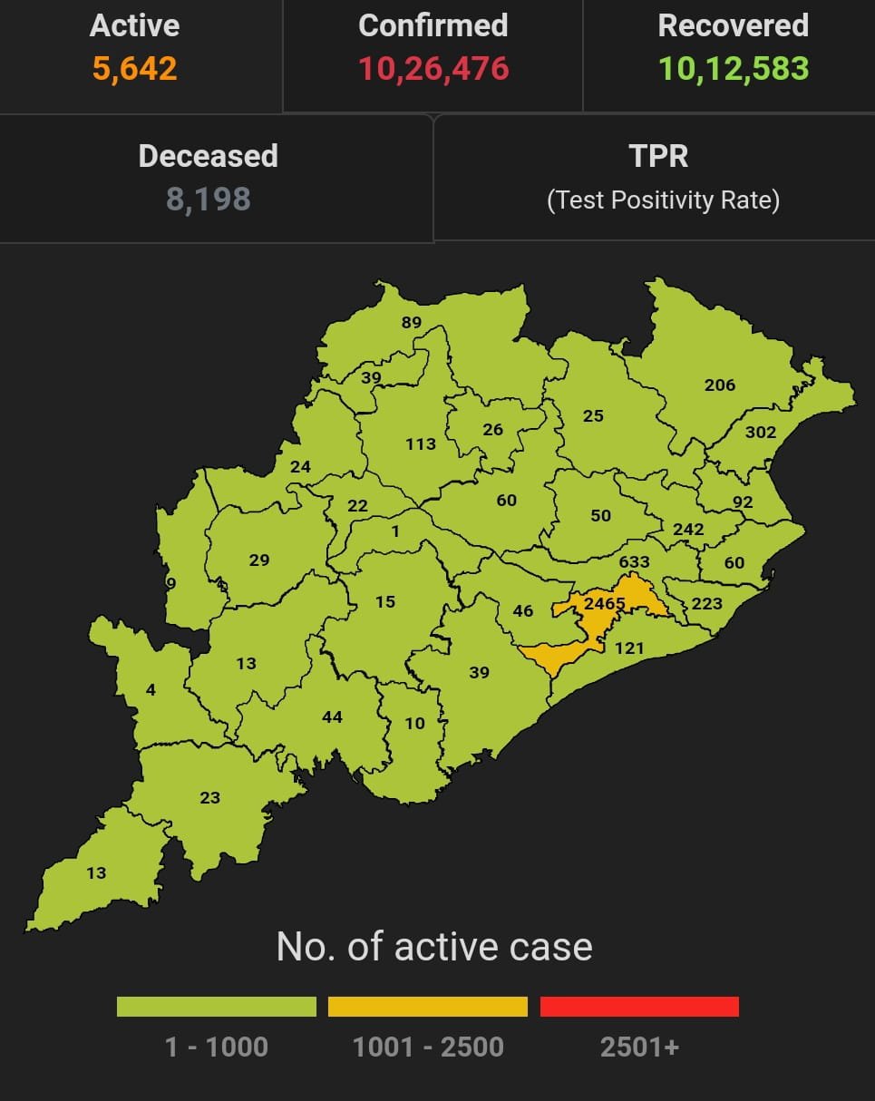 ଭୁବନେଶ୍ବର ୩୦/୦୯(ପିପିଟି); ରାଜ୍ୟରେ ନୂତନ ଆକ୍ରାନ୍ତ ସଂଖ୍ୟା ୬୦୨। ପଜିଟିଭ ସଂଖ୍ୟା ୧୦,୨୬,୪୭୬ ଚିହ୍ନଟ ହୋଇଛନ୍ତି ୧୦,୧୨,୫୮୩ ଜଣ ସୁସ୍ଥ ହୋଇଥିବା ବେଳେ ୫,୬୪୨ ଜଣ ଚିକିତ୍ସିତ ହେଉଛନ୍ତି ଏବଂ ୮୧୯୮ ଜଣଙ୍କର ମୃତ୍ୟୁ ଘଟିଛି ଏବଂ ଅନ୍ଯ ମୃତ୍ୟୁ ୫୩ ହୋଇଛି । ଖୋର୍ଦ୍ଧା ଜିଲ୍ଲାରେ ଆକ୍ରାନ୍ତ ସଂଖ୍ୟା ୧,୬୮,୧୧୬ ସୁସ୍ଥ ସଂଖ୍ୟା ୧,୬୪,୧୪୨ ଚିକିତ୍ସିତ ସଂଖ୍ୟା ୨,୪୬୫, ମୃତ ସଂଖ୍ୟା ୧୪୯୯ କଟକ ଜିଲ୍ଲାରେ ଆକ୍ରାନ୍ତ ସଂଖ୍ୟା ୯୨,୦୪୧, ସୁସ୍ଥ ସଂଖ୍ୟା ୯୧,୫୬୯ ଚିକିତ୍ସିତ ସଂଖ୍ୟା ୬୩୩, ମୃତ ସଂଖ୍ୟା ୮୩୫, ଗଞ୍ଜାମ ଜିଲ୍ଲାରେ ଆକ୍ରାନ୍ତ ସଂଖ୍ୟା ୩୩,୭୫୭ ସୁସ୍ଥ ସଂଖ୍ୟା ୩୩,୨୩୬ ଚିକିତ୍ସିତ ସଂଖ୍ୟା ୩୯ ମୃତ ସଂଖ୍ୟା ୪୭୪, ସୁନ୍ଦରଗଡ ଜିଲ୍ଲାରେ ଆକ୍ରାନ୍ତ ସଂଖ୍ୟା ୬୧,୫୫୬ ସୁସ୍ଥ ସଂଖ୍ୟା ୬୦,୮୮୪ ଚିକିତ୍ସିତ ସଂଖ୍ୟା ୮୯ ,ମୃତ ସଂଖ୍ୟା ୫୭୯, ମାଲକାନଗିରି ଜିଲ୍ଲାରେ ଆକ୍ରାନ୍ତ ସଂଖ୍ୟା ୧୧,୬୫୩ ସୁସ୍ଥ ସଂଖ୍ୟା ୧୧,୫୯୧ ଚିକିତ୍ସିତ ସଂଖ୍ୟା ୧୩,ମୃତ ସଂଖ୍ୟା ୪୬ ବୋଲି ସ୍ୱାସ୍ଥ୍ୟ ପରିବାର କଲ୍ୟାଣ ବିଭାଗ ତରଫରୁ ଏହି ସୂଚନା ମିଳିଛି।