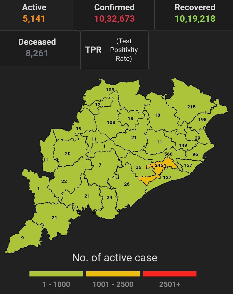 ଭୁବନେଶ୍ବର ୧୨/୧୦(ପିପିଟି); ରାଜ୍ୟରେ ନୂତନ ଆକ୍ରାନ୍ତ ସଂଖ୍ୟା ୫୨୯। ପଜିଟିଭ ସଂଖ୍ୟା ୧୦,୩୨,୬୭୩ ଚିହ୍ନଟ ହୋଇଛନ୍ତି ୧୦,୧୯,୨୧୮ ଜଣ ସୁସ୍ଥ ହୋଇଥିବା ବେଳେ ୫,୧୪୧ ଜଣ ଚିକିତ୍ସିତ ହେଉଛନ୍ତି ଏବଂ ୮୨୬୧ ଜଣଙ୍କର ମୃତ୍ୟୁ ଘଟିଛି ଏବଂ ଅନ୍ଯ ମୃତ୍ୟୁ ୫୩ ହୋଇଛି । ଖୋର୍ଦ୍ଧା ଜିଲ୍ଲାରେ ଆକ୍ରାନ୍ତ ସଂଖ୍ୟା ୧,୭୧,୦୦୬ ସୁସ୍ଥ ସଂଖ୍ୟା ୧,୬୭,୦୧୨ ଚିକିତ୍ସିତ ସଂଖ୍ୟା ୨,୪୬୪, ମୃତ ସଂଖ୍ୟା ୧୫୨୦ କଟକ ଜିଲ୍ଲାରେ ଆକ୍ରାନ୍ତ ସଂଖ୍ୟା ୯୩,୭୭୪, ସୁସ୍ଥ ସଂଖ୍ୟା ୯୨,୩୫୭ ଚିକିତ୍ସିତ ସଂଖ୍ୟା ୫୬୮, ମୃତ ସଂଖ୍ୟା ୮୪୫, ଗଞ୍ଜାମ ଜିଲ୍ଲାରେ ଆକ୍ରାନ୍ତ ସଂଖ୍ୟା ୩୩,୭୯୩ ସୁସ୍ଥ ସଂଖ୍ୟା ୩୩,୨୮୨ ଚିକିତ୍ସିତ ସଂଖ୍ୟା ୨୬ ମୃତ ସଂଖ୍ୟା ୪୭୭, ସୁନ୍ଦରଗଡ ଜିଲ୍ଲାରେ ଆକ୍ରାନ୍ତ ସଂଖ୍ୟା ୬୧,୬୬୮ ସୁସ୍ଥ ସଂଖ୍ୟା ୬୦,୯୭୭ ଚିକିତ୍ସିତ ସଂଖ୍ୟା ୧୦୩ ,ମୃତ ସଂଖ୍ୟା ୫୮୪ ବୋଲି ସ୍ୱାସ୍ଥ୍ୟ ପରିବାର କଲ୍ୟାଣ ବିଭାଗ ତରଫରୁ ଏହି ସୂଚନା ମିଳିଛି।