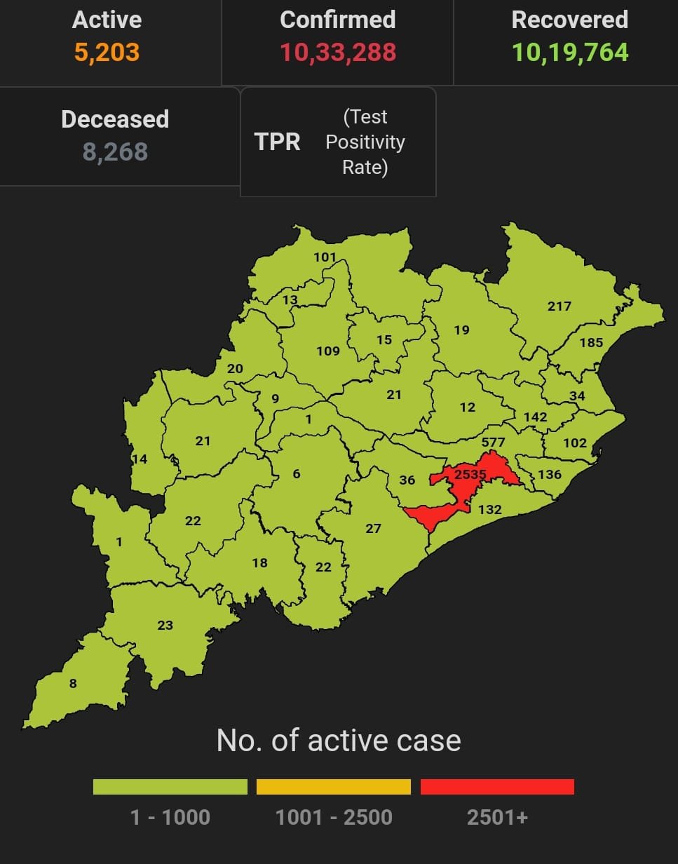 ଭୁବନେଶ୍ବର ୧୩/୧୦(ପିପିଟି); ରାଜ୍ୟରେ ନୂତନ ଆକ୍ରାନ୍ତ ସଂଖ୍ୟା ୬୧୫। ପଜିଟିଭ ସଂଖ୍ୟା ୧୦,୩୩,୨୮୮ ଚିହ୍ନଟ ହୋଇଛନ୍ତି ୧୦,୧୯,୭୬୪ ଜଣ ସୁସ୍ଥ ହୋଇଥିବା ବେଳେ ୫,୨୦୩ ଜଣ ଚିକିତ୍ସିତ ହେଉଛନ୍ତି ଏବଂ ୮୨୬୮ ଜଣଙ୍କର ମୃତ୍ୟୁ ଘଟିଛି ଏବଂ ଅନ୍ଯ ମୃତ୍ୟୁ ୫୩ ହୋଇଛି । ଖୋର୍ଦ୍ଧା ଜିଲ୍ଲାରେ ଆକ୍ରାନ୍ତ ସଂଖ୍ୟା ୧,୭୧,୩୨୯ ସୁସ୍ଥ ସଂଖ୍ୟା ୧,୬୭,୨୬୨ ଚିକିତ୍ସିତ ସଂଖ୍ୟା ୨,୫୩୫, ମୃତ ସଂଖ୍ୟା ୧୫୨୨ କଟକ ଜିଲ୍ଲାରେ ଆକ୍ରାନ୍ତ ସଂଖ୍ୟା ୯୩,୮୪୬, ସୁସ୍ଥ ସଂଖ୍ୟା ୯୨,୪୧୮ ଚିକିତ୍ସିତ ସଂଖ୍ୟା ୫୭୭, ମୃତ ସଂଖ୍ୟା ୮୪୭, ଗଞ୍ଜାମ ଜିଲ୍ଲାରେ ଆକ୍ରାନ୍ତ ସଂଖ୍ୟା ୩୩,୭୯୬ ସୁସ୍ଥ ସଂଖ୍ୟା ୩୩,୨୮୪ ଚିକିତ୍ସିତ ସଂଖ୍ୟା ୨୭ ମୃତ ସଂଖ୍ୟା ୪୭୭, ସୁନ୍ଦରଗଡ ଜିଲ୍ଲାରେ ଆକ୍ରାନ୍ତ ସଂଖ୍ୟା ୬୧,୬୭୬ ସୁସ୍ଥ ସଂଖ୍ୟା ୬୦,୯୮୬ ଚିକିତ୍ସିତ ସଂଖ୍ୟା ୧୦୧ ,ମୃତ ସଂଖ୍ୟା ୫୮୫ ବୋଲି ସ୍ୱାସ୍ଥ୍ୟ ପରିବାର କଲ୍ୟାଣ ବିଭାଗ ତରଫରୁ ଏହି ସୂଚନା ମିଳିଛି।