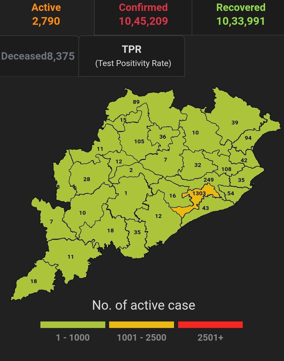 ଭୁବନେଶ୍ବର ୧୩/୧୦(ପିପିଟି); ରାଜ୍ୟରେ ନୂତନ ଆକ୍ରାନ୍ତ ସଂଖ୍ୟା ୨୪୭। ପଜିଟିଭ ସଂଖ୍ୟା ୧୦,୪୫,୨୦୯ ଚିହ୍ନଟ ହୋଇଛନ୍ତି ୧୦,୩୩,୯୯୧ ଜଣ ସୁସ୍ଥ ହୋଇଥିବା ବେଳେ ୨,୭୯୦ ଜଣ ଚିକିତ୍ସିତ ହେଉଛନ୍ତି ଏବଂ ୮୩୭୫ ଜଣଙ୍କର ମୃତ୍ୟୁ ଘଟିଛି ଏବଂ ଅନ୍ଯ ମୃତ୍ୟୁ ୫୩ ହୋଇଛି । ଖୋର୍ଦ୍ଧା ଜିଲ୍ଲାରେ ଆକ୍ରାନ୍ତ ସଂଖ୍ୟା ୧,୭୭,୧୫୭ ସୁସ୍ଥ ସଂଖ୍ୟା ୧,୭୪,୨୮୦ ଚିକିତ୍ସିତ ସଂଖ୍ୟା ୧,୩୦୩, ମୃତ ସଂଖ୍ୟା ୧୫୬୧ କଟକ ଜିଲ୍ଲାରେ ଆକ୍ରାନ୍ତ ସଂଖ୍ୟା ୯୪,୯୫୫, ସୁସ୍ଥ ସଂଖ୍ୟା ୯୩,୮୪୮ ଚିକିତ୍ସିତ ସଂଖ୍ୟା ୨୪୯, ମୃତ ସଂଖ୍ୟା ୮୫୪, ଗଞ୍ଜାମ ଜିଲ୍ଲାରେ ଆକ୍ରାନ୍ତ ସଂଖ୍ୟା ୩୩,୮୭୫ ସୁସ୍ଥ ସଂଖ୍ୟା ୩୩,୩୭୫ ଚିକିତ୍ସିତ ସଂଖ୍ୟା ୧୨ ମୃତ ସଂଖ୍ୟା ୪୮୦, ସୁନ୍ଦରଗଡ ଜିଲ୍ଲାରେ ଆକ୍ରାନ୍ତ ସଂଖ୍ୟା ୬୧,୯୪୬ ସୁସ୍ଥ ସଂଖ୍ୟା ୬୧,୨୬୩ ଚିକିତ୍ସିତ ସଂଖ୍ୟା ୮୯, ମୃତ ସଂଖ୍ୟା ୫୯୦ ବୋଲି ସ୍ୱାସ୍ଥ୍ୟ ପରିବାର କଲ୍ୟାଣ ବିଭାଗ ତରଫରୁ ଏହି ସୂଚନା ମିଳିଛି।