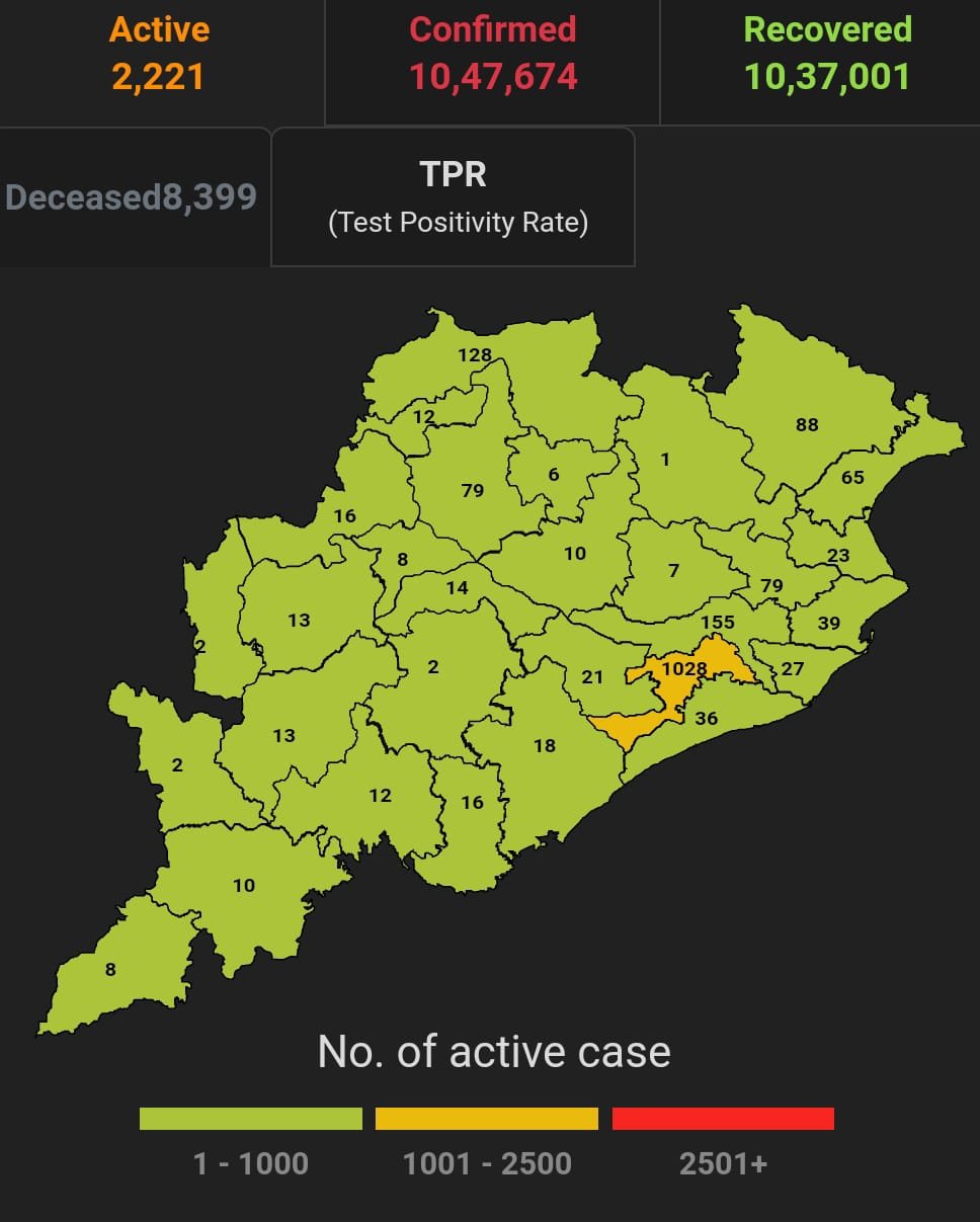 ଭୁବନେଶ୍ବର ୨୪/୧୦(ପିପିଟି); ରାଜ୍ୟରେ ନୂତନ ଆକ୍ରାନ୍ତ ସଂଖ୍ୟା ୨୮୮। ପଜିଟିଭ ସଂଖ୍ୟା ୧୦,୪୭,୬୭୪ ଚିହ୍ନଟ ହୋଇଛନ୍ତି ୧୦,୩୭,୦୦୧ ଜଣ ସୁସ୍ଥ ହୋଇଥିବା ବେଳେ ୨,୨୨୧ ଜଣ ଚିକିତ୍ସିତ ହେଉଛନ୍ତି ଏବଂ ୮୩୯୯ ଜଣଙ୍କର ମୃତ୍ୟୁ ଘଟିଛି ଏବଂ ଅନ୍ଯ ମୃତ୍ୟୁ ୫୩ ହୋଇଛି । ଖୋର୍ଦ୍ଧା ଜିଲ୍ଲାରେ ଆକ୍ରାନ୍ତ ସଂଖ୍ୟା ୧,୭୮,୩୫୫ ସୁସ୍ଥ ସଂଖ୍ୟା ୧,୭୫,୭୪୧ ଚିକିତ୍ସିତ ସଂଖ୍ୟା ୧,୦୨୭, ମୃତ ସଂଖ୍ୟା ୧୫୭୬ କଟକ ଜିଲ୍ଲାରେ ଆକ୍ରାନ୍ତ ସଂଖ୍ୟା ୯୫,୧୨୩, ସୁସ୍ଥ ସଂଖ୍ୟା ୯୪,୧୦୯ ଚିକିତ୍ସିତ ସଂଖ୍ୟା ୧୫୫, ମୃତ ସଂଖ୍ୟା ୮୫୫, ଗଞ୍ଜାମ ଜିଲ୍ଲାରେ ଆକ୍ରାନ୍ତ ସଂଖ୍ୟା ୩୩,୯୦୨ ସୁସ୍ଥ ସଂଖ୍ୟା ୩୩,୩୯୫ ଚିକିତ୍ସିତ ସଂଖ୍ୟା ୧୮ ମୃତ ସଂଖ୍ୟା ୪୮୧, ସୁନ୍ଦରଗଡ ଜିଲ୍ଲାରେ ଆକ୍ରାନ୍ତ ସଂଖ୍ୟା ୬୨,୦୬୭ ସୁସ୍ଥ ସଂଖ୍ୟା ୬୧,୩୪୪ ଚିକିତ୍ସିତ ସଂଖ୍ୟା ୧୨୮, ମୃତ ସଂଖ୍ୟା ୫୯୧ ବୋଲି ସ୍ୱାସ୍ଥ୍ୟ ପରିବାର କଲ୍ୟାଣ ବିଭାଗ ତରଫରୁ ଏହି ସୂଚନା ମିଳିଛି।