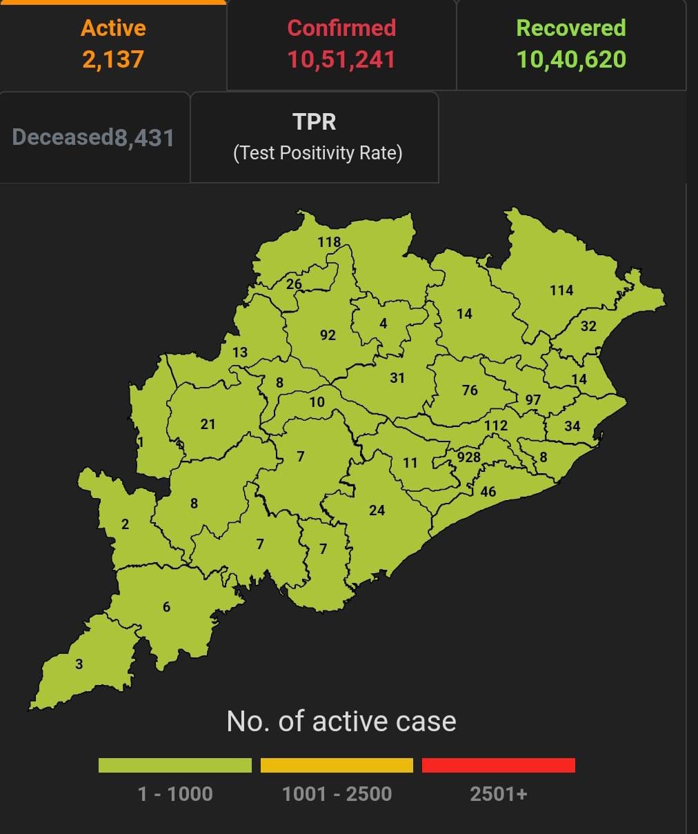 ଭୁବନେଶ୍ବର ୧୦/୧୨(ପିପିଟି); ରାଜ୍ୟରେ ନୂତନ ଆକ୍ରାନ୍ତ ସଂଖ୍ୟା ୨୮୬ ପଜିଟିଭ ସଂଖ୍ୟା ୧୦,୫୧,୨୪୧ ଚିହ୍ନଟ ହୋଇଛନ୍ତି ୧୦,୪୦,୬୨୦ ଜଣ ସୁସ୍ଥ ହୋଇଥିବା ବେଳେ ୨,୧୩୭ ଜଣ ଚିକିତ୍ସିତ ହେଉଛନ୍ତି ଏବଂ ୮୪୩୧ ଜଣଙ୍କର ମୃତ୍ୟୁ ଘଟିଛି ଏବଂ ଅନ୍ଯ ମୃତ୍ୟୁ ୫୩ ହୋଇଛି । ଖୋର୍ଦ୍ଧା ଜିଲ୍ଲାରେ ଆକ୍ରାନ୍ତ ସଂଖ୍ୟା ୧,୭୯,୯୬୬ ସୁସ୍ଥ ସଂଖ୍ୟା ୧,୭୭,୪୪୦ ଚିକିତ୍ସିତ ସଂଖ୍ୟା ୯୨୮, ମୃତ ସଂଖ୍ୟା ୧୫୮୮ କଟକ ଜିଲ୍ଲାରେ ଆକ୍ରାନ୍ତ ସଂଖ୍ୟା ୯୫,୩୩୪, ସୁସ୍ଥ ସଂଖ୍ୟା ୯୪,୩୬୦ ଚିକିତ୍ସିତ ସଂଖ୍ୟା ୧୧୨, ମୃତ ସଂଖ୍ୟା ୮୫୮, ଗଞ୍ଜାମ ଜିଲ୍ଲାରେ ଆକ୍ରାନ୍ତ ସଂଖ୍ୟା ୩୩,୯୪୮ ସୁସ୍ଥ ସଂଖ୍ୟା ୩୩,୪୩୫ ଚିକିତ୍ସିତ ସଂଖ୍ୟା ୨୪ ମୃତ ସଂଖ୍ୟା ୪୮୧, ସୁନ୍ଦରଗଡ ଜିଲ୍ଲାରେ ଆକ୍ରାନ୍ତ ସଂଖ୍ୟା ୬୨,୨୪୪ ସୁସ୍ଥ ସଂଖ୍ୟା ୬୧,୫୩୦ ଚିକିତ୍ସିତ ସଂଖ୍ୟା ୧୧୮, ମୃତ ସଂଖ୍ୟା ୫୯୨ ବୋଲି ସ୍ୱାସ୍ଥ୍ୟ ପରିବାର କଲ୍ୟାଣ ବିଭାଗ ତରଫରୁ ଏହି ସୂଚନା ମିଳିଛି।