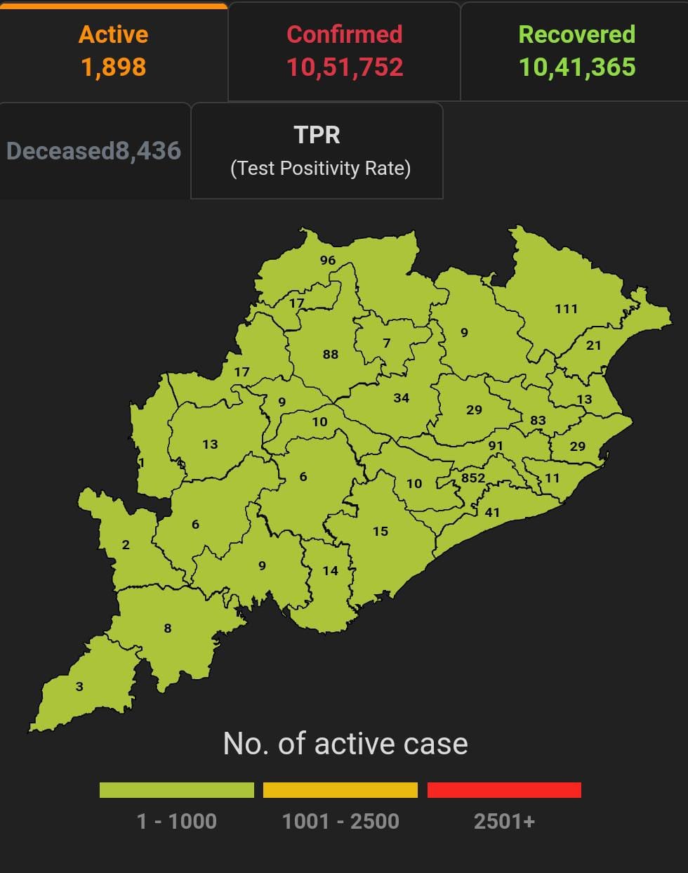 ଭୁବନେଶ୍ବର ୧୩/୧୨(ପିପିଟି); ରାଜ୍ୟରେ ନୂତନ ଆକ୍ରାନ୍ତ ସଂଖ୍ୟା ୧୭୮ ପଜିଟିଭ ସଂଖ୍ୟା ୧୦,୫୧,୭୫୨ ଚିହ୍ନଟ ହୋଇଛନ୍ତି ୧୦,୪୧,୩୬୫ ଜଣ ସୁସ୍ଥ ହୋଇଥିବା ବେଳେ ୧,୮୯୮ ଜଣ ଚିକିତ୍ସିତ ହେଉଛନ୍ତି ଏବଂ ୮୪୩୬ଜଣଙ୍କର ମୃତ୍ୟୁ ଘଟିଛି ଏବଂ ଅନ୍ଯ ମୃତ୍ୟୁ ୫୩ ହୋଇଛି । ଖୋର୍ଦ୍ଧା ଜିଲ୍ଲାରେ ଆକ୍ରାନ୍ତ ସଂଖ୍ୟା ୧,୮୦,୨୨୩ ସୁସ୍ଥ ସଂଖ୍ୟା ୧,୭୭,୭୭୨ ଚିକିତ୍ସିତ ସଂଖ୍ୟା ୮୫୨, ମୃତ ସଂଖ୍ୟା ୧୫୮୯ କଟକ ଜିଲ୍ଲାରେ ଆକ୍ରାନ୍ତ ସଂଖ୍ୟା ୯୫,୩୫୮, ସୁସ୍ଥ ସଂଖ୍ୟା ୯୪,୪୦୫ ଚିକିତ୍ସିତ ସଂଖ୍ୟା ୯୧, ମୃତ ସଂଖ୍ୟା ୮୫୮, ଗଞ୍ଜାମ ଜିଲ୍ଲାରେ ଆକ୍ରାନ୍ତ ସଂଖ୍ୟା ୩୩,୯୫୦ ସୁସ୍ଥ ସଂଖ୍ୟା ୩୩,୪୪୬ ଚିକିତ୍ସିତ ସଂଖ୍ୟା ୧୫ ମୃତ ସଂଖ୍ୟା ୪୮୧, ସୁନ୍ଦରଗଡ ଜିଲ୍ଲାରେ ଆକ୍ରାନ୍ତ ସଂଖ୍ୟା ୬୨,୨୭୧ ସୁସ୍ଥ ସଂଖ୍ୟା ୬୧,୫୭୯ ଚିକିତ୍ସିତ ସଂଖ୍ୟା ୯୬, ମୃତ ସଂଖ୍ୟା ୫୯୨ ବୋଲି ସ୍ୱାସ୍ଥ୍ୟ ପରିବାର କଲ୍ୟାଣ ବିଭାଗ ତରଫରୁ ଏହି ସୂଚନା ମିଳିଛି।