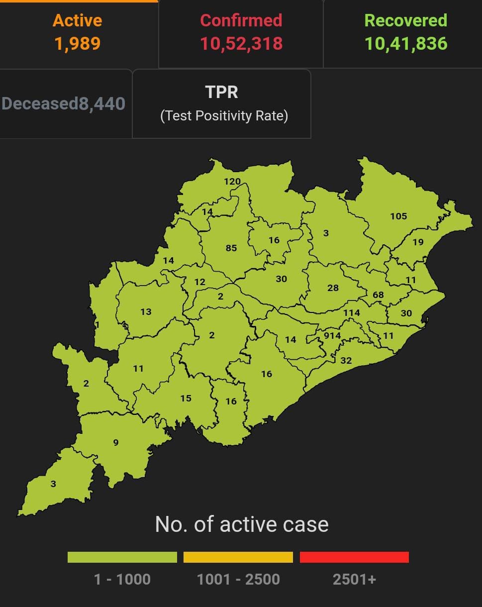 ଭୁବନେଶ୍ବର ୧୬/୧୨(ପିପିଟି); ରାଜ୍ୟରେ ନୂତନ ଆକ୍ରାନ୍ତ ସଂଖ୍ୟା ୧୭୩ ପଜିଟିଭ ସଂଖ୍ୟା ୧୦,୫୨,୩୧୮ ଚିହ୍ନଟ ହୋଇଛନ୍ତି ୧୦,୪୧,୮୩୬ ଜଣ ସୁସ୍ଥ ହୋଇଥିବା ବେଳେ ୧,୯୮୯ ଜଣ ଚିକିତ୍ସିତ ହେଉଛନ୍ତି ଏବଂ ୮୪୪୦ ଜଣଙ୍କର ମୃତ୍ୟୁ ଘଟିଛି ଏବଂ ଅନ୍ଯ ମୃତ୍ୟୁ ୫୩ ହୋଇଛି । ଖୋର୍ଦ୍ଧା ଜିଲ୍ଲାରେ ଆକ୍ରାନ୍ତ ସଂଖ୍ୟା ୧,୮୦,୫୦୬ ସୁସ୍ଥ ସଂଖ୍ୟା ୧,୭୭,୯୯୦ ଚିକିତ୍ସିତ ସଂଖ୍ୟା ୯୧୪, ମୃତ ସଂଖ୍ୟା ୧୫୯୨ କଟକ ଜିଲ୍ଲାରେ ଆକ୍ରାନ୍ତ ସଂଖ୍ୟା ୯୫,୩୯୭, ସୁସ୍ଥ ସଂଖ୍ୟା ୯୪,୪୨୧ ଚିକିତ୍ସିତ ସଂଖ୍ୟା ୧୧୪, ମୃତ ସଂଖ୍ୟା ୮୫୮, ଗଞ୍ଜାମ ଜିଲ୍ଲାରେ ଆକ୍ରାନ୍ତ ସଂଖ୍ୟା ୩୩,୯୫୬ ସୁସ୍ଥ ସଂଖ୍ୟା ୩୩,୪୫୧ ଚିକିତ୍ସିତ ସଂଖ୍ୟା ୧୧ ମୃତ ସଂଖ୍ୟା ୪୮୧, ସୁନ୍ଦରଗଡ ଜିଲ୍ଲାରେ ଆକ୍ରାନ୍ତ ସଂଖ୍ୟା ୬୨,୩୧୧ ସୁସ୍ଥ ସଂଖ୍ୟା ୬୧,୫୯୫ ଚିକିତ୍ସିତ ସଂଖ୍ୟା ୧୨୦, ମୃତ ସଂଖ୍ୟା ୫୯୨ ବୋଲି ସ୍ୱାସ୍ଥ୍ୟ ପରିବାର କଲ୍ୟାଣ ବିଭାଗ ତରଫରୁ ଏହି ସୂଚନା ମିଳିଛି।