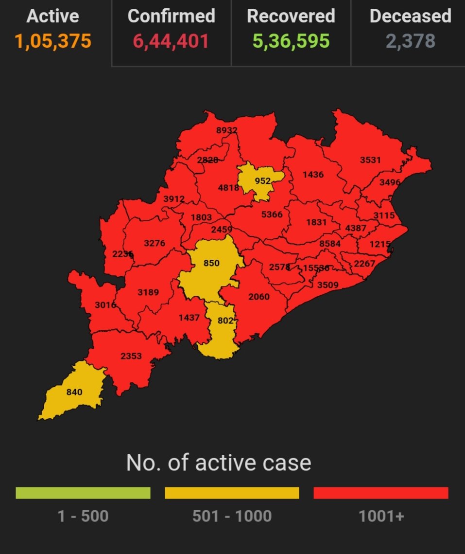 ଭୁବନେଶ୍ବର ୧୯/୦୫(ପିପିଟି); ରାଜ୍ୟରେ ନୂତନ ଆକ୍ରାନ୍ତ ସଂଖ୍ୟା ୧୦୩୨୧। ପଜିଟିଭ ସଂଖ୍ୟା ୬,୩୩,୩୦୨ ଚିହ୍ନଟ ହୋଇଛନ୍ତି ୫,୨୬,୩୫୩ ଜଣ ସୁସ୍ଥ ହୋଇଥିବା ବେଳେ ୧,୦୪,୫୩୯ ଜଣ ଚିକିତ୍ସିତ ହେଉଛନ୍ତି ଏବଂ ୨୩୫୭ ଜଣଙ୍କର ମୃତ୍ୟୁ ଘଟିଛି ଏବଂ ଅନ୍ଯ ମୃତ୍ୟୁ ୫୩ ହୋଇଛି । ଖୋର୍ଦ୍ଧା ଜିଲ୍ଲାରେ ଆକ୍ରାନ୍ତ ସଂଖ୍ୟା ୯୭,୪୪୯ ସୁସ୍ଥ ସଂଖ୍ୟା ୮୧,୫୨୯ ଚିକିତ୍ସିତ ସଂଖ୍ୟା ୧୫,୪୯୬, ମୃତ ସଂଖ୍ୟା ୪୧୪ କଟକ ଜିଲ୍ଲାରେ ଆକ୍ରାନ୍ତ ସଂଖ୍ୟା ୪୯,୯୩୧ ସୁସ୍ଥ ସଂଖ୍ୟା ୪୧,୧୭୧ ଚିକିତ୍ସିତ ସଂଖ୍ୟା ୮୬୦୫, ମୃତ ସଂଖ୍ୟା ୧୫୧, ଗଞ୍ଜାମ ଜିଲ୍ଲାରେ ଆକ୍ରାନ୍ତ ସଂଖ୍ୟା ୨୮,୮୨୮, ସୁସ୍ଥ ସଂଖ୍ୟା ୨୬,୪୯୪ ଚିକିତ୍ସିତ ସଂଖ୍ୟା ୨୦୫୯, ମୃତ ସଂଖ୍ୟା ୨୬୭, ସୁନ୍ଦରଗଡ ଜିଲ୍ଲାରେ ଆକ୍ରାନ୍ତ ସଂଖ୍ୟା ୪୬,୫୫୬ ସୁସ୍ଥ ସଂଖ୍ୟା ୩୩,୪୩୬ ଚିକିତ୍ସିତ ସଂଖ୍ୟା ୮୮୯୪ ,ମୃତ ସଂଖ୍ୟା ୨୨୯ ବୋଲି ସ୍ୱାସ୍ଥ୍ୟ ପରିବାର କଲ୍ୟାଣ ବିଭାଗ ତରଫରୁ ଏହି ସୂଚନା ମିଳିଛି।