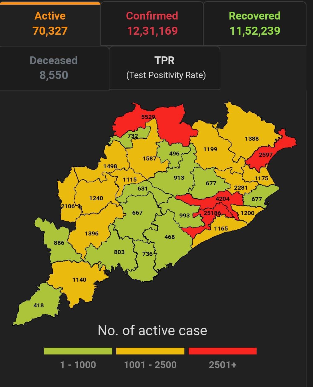 ଭୁବନେଶ୍ବର ୨୭/୦୧(ପିପିଟି); ରାଜ୍ୟରେ ନୂତନ ଆକ୍ରାନ୍ତ ସଂଖ୍ୟା ୫,୯୦୧ ପଜିଟିଭ ସଂଖ୍ୟା ୧୨,୩୧,୧୬୯ ଚିହ୍ନଟ ହୋଇଛନ୍ତି ୧୧,୫୨,୨୩୯ ଜଣ ସୁସ୍ଥ ହୋଇଥିବା ବେଳେ ୭୦,୩୨୭ ଜଣ ଚିକିତ୍ସିତ ହେଉଛନ୍ତି ଏବଂ ୮୫୫୦ ଜଣଙ୍କର ମୃତ୍ୟୁ ଘଟିଛି ଏବଂ ଅନ୍ଯ ମୃତ୍ୟୁ ୫୩ ହୋଇଛି । ଖୋର୍ଦ୍ଧା ଜିଲ୍ଲାରେ ଆକ୍ରାନ୍ତ ସଂଖ୍ୟା ୨,୩୪,୪୧୮ ସୁସ୍ଥ ସଂଖ୍ୟା ୨,୦୭,୫୯୬ ଚିକିତ୍ସିତ ସଂଖ୍ୟା ୨୫,୧୮୬ ମୃତ ସଂଖ୍ୟା ୧୬୨୬ କଟକ ଜିଲ୍ଲାରେ ଆକ୍ରାନ୍ତ ସଂଖ୍ୟା ୧,୦୯,୫୭୫, ସୁସ୍ଥ ସଂଖ୍ୟା ,୧,୦୪,୪୯୯ ଚିକିତ୍ସିତ ସଂଖ୍ୟା ୪,୨୦୪, ମୃତ ସଂଖ୍ୟା ୮୬୮, ଗଞ୍ଜାମ ଜିଲ୍ଲାରେ ଆକ୍ରାନ୍ତ ସଂଖ୍ୟା ୩୫,୭୬୯ ସୁସ୍ଥ ସଂଖ୍ୟା ୩୪,୮୦୮ ଚିକିତ୍ସିତ ସଂଖ୍ୟା ୪୬୮ ମୃତ ସଂଖ୍ୟା ୪୮୫, ସୁନ୍ଦରଗଡ ଜିଲ୍ଲାରେ ଆକ୍ରାନ୍ତ ସଂଖ୍ୟା ୮୫,୫୫୭ ସୁସ୍ଥ ସଂଖ୍ୟା ୭୯,୫୨୦ ଚିକିତ୍ସିତ ସଂଖ୍ୟା ୫,୫୨୯ ମୃତ ସଂଖ୍ୟା ୬୦୪ ବୋଲି ସ୍ୱାସ୍ଥ୍ୟ ପରିବାର କଲ୍ୟାଣ ବିଭାଗ ତରଫରୁ ଏହି ସୂଚନା ମିଳିଛି।