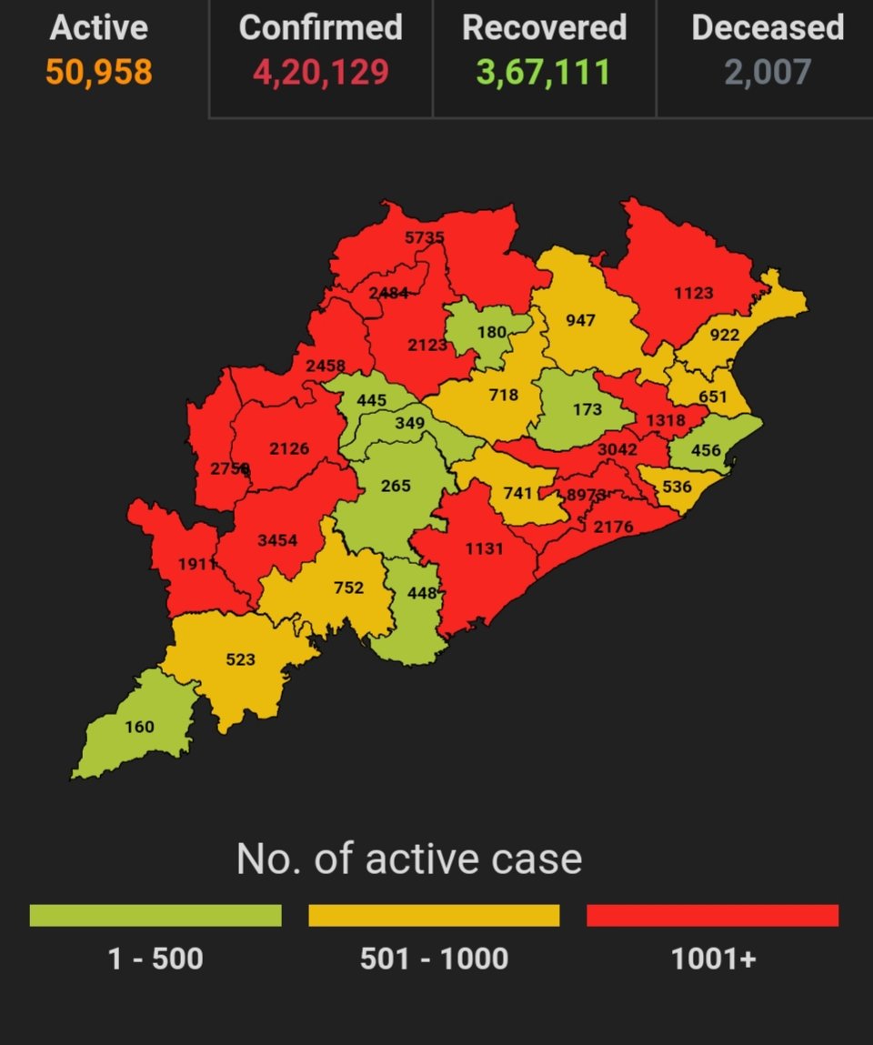 ଭୁବନେଶ୍ବର ୨୭/୦୪(ପିପିଟି); ରାଜ୍ୟରେ ନୂତନ ଆକ୍ରାନ୍ତ ସଂଖ୍ୟା ୬୦୭୩। ପଜିଟିଭ ସଂଖ୍ୟା ୪,୨୦,୧୨୯ ଚିହ୍ନଟ ହୋଇଛନ୍ତି ୩,୬୭,୧୧୧ ଜଣ ସୁସ୍ଥ ହୋଇଥିବା ବେଳେ ୫୦,୯୫୮ ଜଣ ଚିକିତ୍ସିତ ହେଉଛନ୍ତି ଏବଂ ୨୦୦୭ ଜଣଙ୍କର ମୃତ୍ୟୁ ଘଟିଛି ଏବଂ ଅନ୍ଯ ମୃତ୍ୟୁ ୫୩ ହୋଇଛି । ଖୋର୍ଦ୍ଧା ଜିଲ୍ଲାରେ ଆକ୍ରାନ୍ତ ସଂଖ୍ୟା ୬୬,୨୩୬ ସୁସ୍ଥ ସଂଖ୍ୟା ୫୬,୯୦୨ ଚିକିତ୍ସିତ ସଂଖ୍ୟା ୮୯୭୩, ମୃତ ସଂଖ୍ୟା ୩୫୧, କଟକ ଜିଲ୍ଲାରେ ଆକ୍ରାନ୍ତ ସଂଖ୍ୟା ୩୩,୭୩୦ ସୁସ୍ଥ ସଂଖ୍ୟା ୩୦,୫୩୯ ଚିକିତ୍ସିତ ସଂଖ୍ୟା ୩୦୪୨, ମୃତ ସଂଖ୍ୟା ୧୪୫, ଗଞ୍ଜାମ ଜିଲ୍ଲାରେ ଆକ୍ରାନ୍ତ ସଂଖ୍ୟା ୨୩,୮୪୦, ସୁସ୍ଥ ସଂଖ୍ୟା ୨୨,୪୪୪ ଚିକିତ୍ସିତ ସଂଖ୍ୟା ୧୧୩୧ ମୃତ ସଂଖ୍ୟା ୨୫୭, ସୁନ୍ଦରଗଡ ଜିଲ୍ଲାରେ ଆକ୍ରାନ୍ତ ସଂଖ୍ୟା ୨୬,୧୧୭ ସୁସ୍ଥ ସଂଖ୍ୟା ୨୦,୧୯୩, ଚିକିତ୍ସିତ ସଂଖ୍ୟା ୫୭୩୫, ମୃତ ସଂଖ୍ୟା ୧୮୫ ବୋଲି ସ୍ୱାସ୍ଥ୍ୟ ପରିବାର କଲ୍ୟାଣ ବିଭାଗ ତରଫରୁ ଏହି ସୂଚନା ମିଳିଛି।