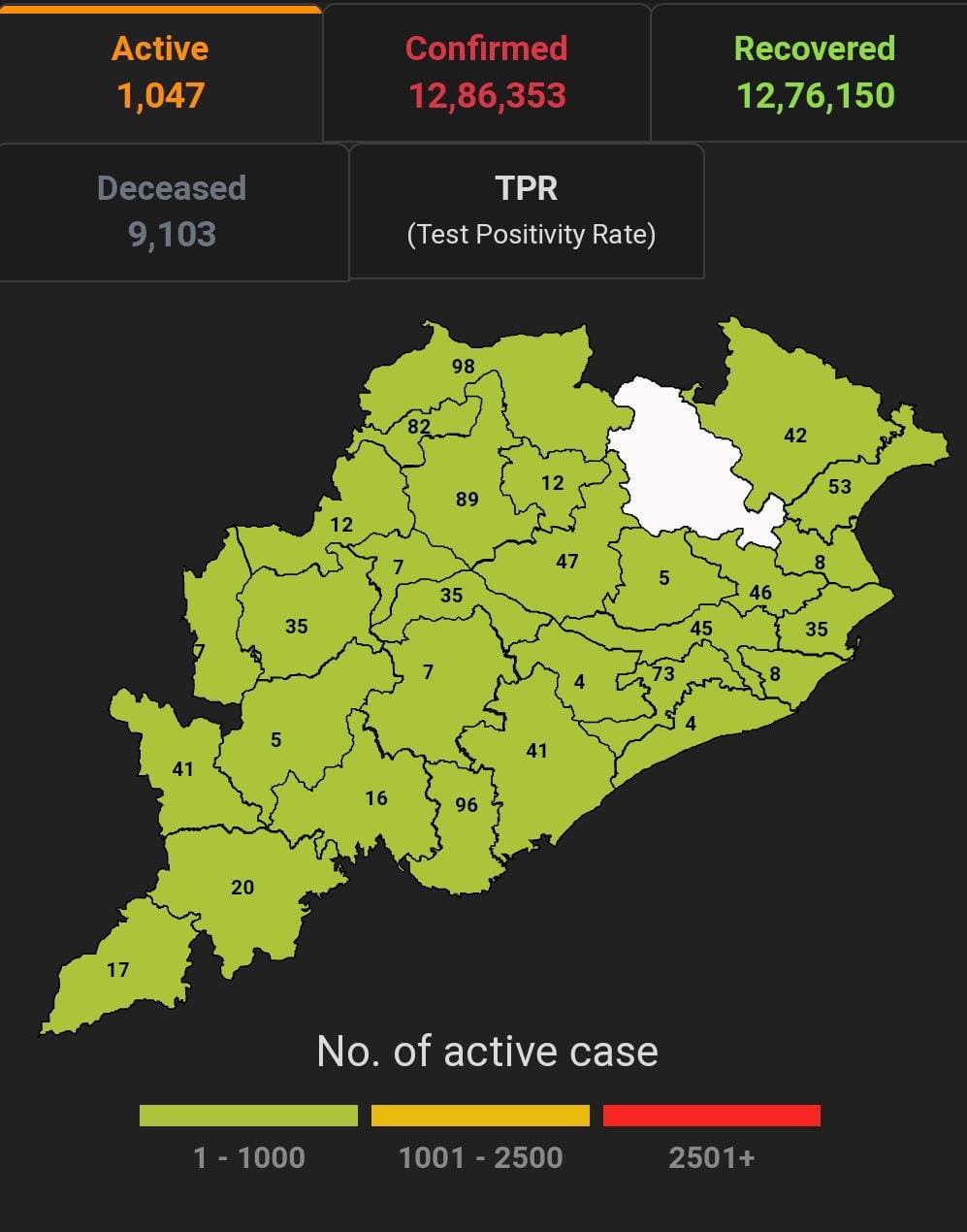 ଭୁବନେଶ୍ବର ୧୦/୦୩(ପିପିଟି); ରାଜ୍ୟରେ ନୂତନ ଆକ୍ରାନ୍ତ ସଂଖ୍ୟା ୧୦୮ ପଜିଟିଭ ସଂଖ୍ୟା ୧୨,୮୬,୩୫୩ ଚିହ୍ନଟ ହୋଇଛନ୍ତି ୧୨,୭୬,୧୫୦ ଜଣ ସୁସ୍ଥ ହୋଇଥିବା ବେଳେ ୧,୦୪୭ ଜଣ ଚିକିତ୍ସିତ ହେଉଛନ୍ତି ଏବଂ ୯,୧୦୩ ଜଣଙ୍କର ମୃତ୍ୟୁ ଘଟିଛି ଏବଂ ଅନ୍ଯ ମୃତ୍ୟୁ ୫୩ ହୋଇଛି । ଖୋର୍ଦ୍ଧା ଜିଲ୍ଲାରେ ଆକ୍ରାନ୍ତ ସଂଖ୍ୟା ୨,୪୪,୬୩୪ ସୁସ୍ଥ ସଂଖ୍ୟା ୨,୪୨,୮୦୩ ଚିକିତ୍ସିତ ସଂଖ୍ୟା ୭୩ ମୃତ ସଂଖ୍ୟା ୧୭୪୮, କଟକ ଜିଲ୍ଲାରେ ଆକ୍ରାନ୍ତ ସଂଖ୍ୟା ୧,୧୩,୬୭୪, ସୁସ୍ଥ ସଂଖ୍ୟା ୧,୧୨,୭୧୯ ଚିକିତ୍ସିତ ସଂଖ୍ୟା ୪୫, ମୃତ ସଂଖ୍ୟା ୯୦୬, ଗଞ୍ଜାମ ଜିଲ୍ଲାରେ ଆକ୍ରାନ୍ତ ସଂଖ୍ୟା ୩୬,୬୫୩ ସୁସ୍ଥ ସଂଖ୍ୟା ୩୬,୦୯୪ ଚିକିତ୍ସିତ ସଂଖ୍ୟା ୪୧, ମୃତ ସଂଖ୍ୟା ୫୧୦ ସୁନ୍ଦରଗଡ ଜିଲ୍ଲାରେ ଆକ୍ରାନ୍ତ ସଂଖ୍ୟା ୯୦,୬୫୦ ସୁସ୍ଥ ସଂଖ୍ୟା ୮୯,୮୭୮ ଚିକିତ୍ସିତ ସଂଖ୍ୟା ୯୮ ମୃତ ସଂଖ୍ୟା ୬୭୦ ବୋଲି ସ୍ୱାସ୍ଥ୍ୟ ପରିବାର କଲ୍ୟାଣ ବିଭାଗ ତରଫରୁ ଏହି ସୂଚନା ମିଳିଛି।