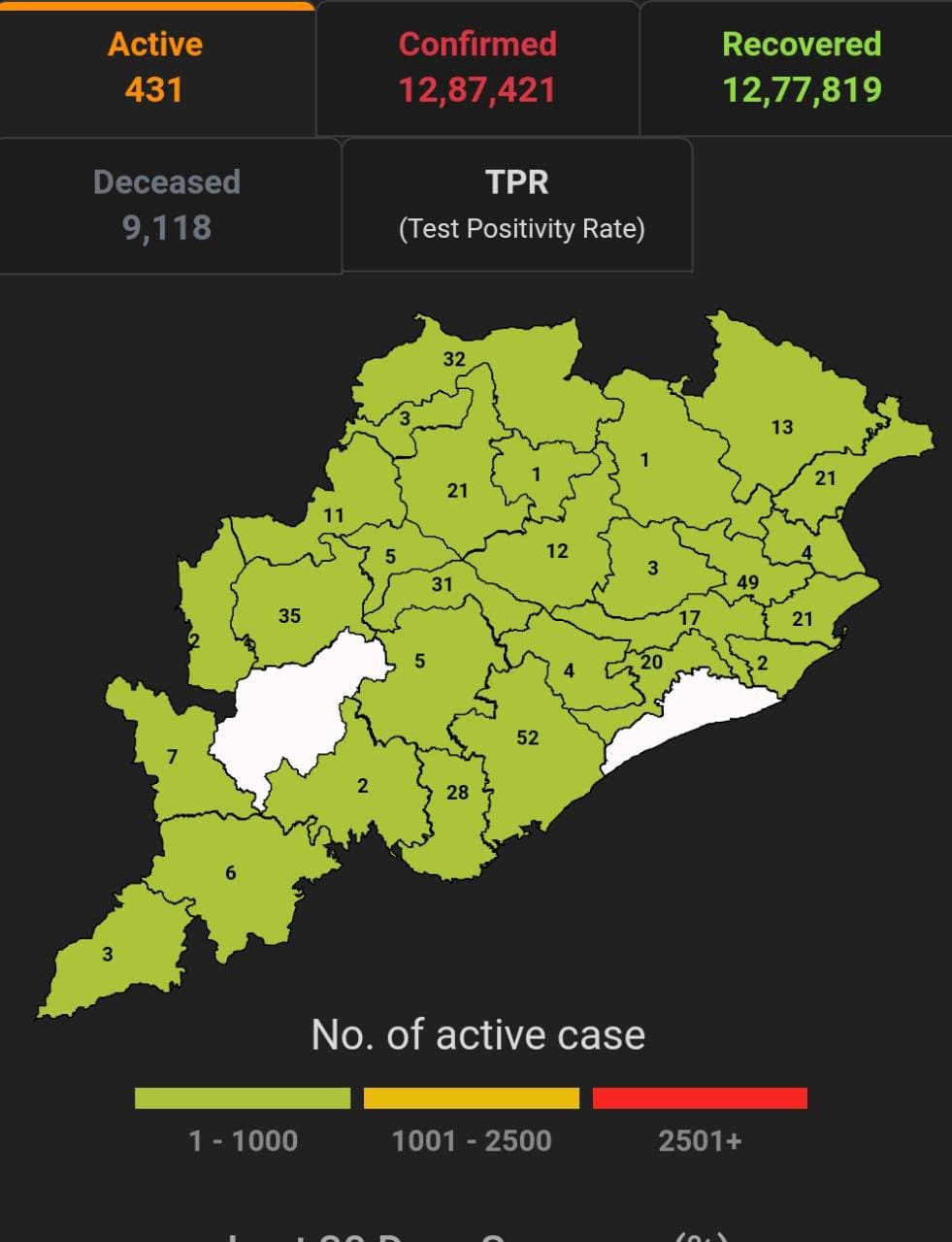 ଭୁବନେଶ୍ବର ୨୬/୦୩(ପିପିଟି); ରାଜ୍ୟରେ ନୂତନ ଆକ୍ରାନ୍ତ ସଂଖ୍ୟା ୪୩ ପଜିଟିଭ ସଂଖ୍ୟା ୧୨,୮୭,୪୨୧ ଚିହ୍ନଟ ହୋଇଛନ୍ତି ୧୨,୭୭,୮୧୯ ଜଣ ସୁସ୍ଥ ହୋଇଥିବା ବେଳେ ୪୩୧ ଜଣ ଚିକିତ୍ସିତ ହେଉଛନ୍ତି ଏବଂ ୯,୧୧୮ ଜଣଙ୍କର ମୃତ୍ୟୁ ଘଟିଛି ଏବଂ ଅନ୍ଯ ମୃତ୍ୟୁ ୫୩ ହୋଇଛି । ଖୋର୍ଦ୍ଧା ଜିଲ୍ଲାରେ ଆକ୍ରାନ୍ତ ସଂଖ୍ୟା ୨,୪୪,୭୨୦ ସୁସ୍ଥ ସଂଖ୍ୟା ୨,୪୨,୯୪୨ ଚିକିତ୍ସିତ ସଂଖ୍ୟା ୨୦ ମୃତ ସଂଖ୍ୟା ୧୭୪୮, କଟକ ଜିଲ୍ଲାରେ ଆକ୍ରାନ୍ତ ସଂଖ୍ୟା ୧,୧୩,୭୧୦, ସୁସ୍ଥ ସଂଖ୍ୟା ୧,୧୨,୭୮୨ ଚିକିତ୍ସିତ ସଂଖ୍ୟା ୧୭, ମୃତ ସଂଖ୍ୟା ୯୦୭, ଗଞ୍ଜାମ ଜିଲ୍ଲାରେ ଆକ୍ରାନ୍ତ ସଂଖ୍ୟା ୩୬,୭୫୨ ସୁସ୍ଥ ସଂଖ୍ୟା ୩୬,୧୮୧ ଚିକିତ୍ସିତ ସଂଖ୍ୟା ୫୨, ମୃତ ସଂଖ୍ୟା ୫୧୧ ସୁନ୍ଦରଗଡ ଜିଲ୍ଲାରେ ଆକ୍ରାନ୍ତ ସଂଖ୍ୟା ୯୦,୭୬୫ ସୁସ୍ଥ ସଂଖ୍ୟା ୯୦,୦୪୮ଚିକିତ୍ସିତ ସଂଖ୍ୟା ୩୨ ମୃତ ସଂଖ୍ୟା ୬୮୧ ବୋଲି ସ୍ୱାସ୍ଥ୍ୟ ପରିବାର କଲ୍ୟାଣ ବିଭାଗ ତରଫରୁ ଏହି ସୂଚନା ମିଳିଛି।
