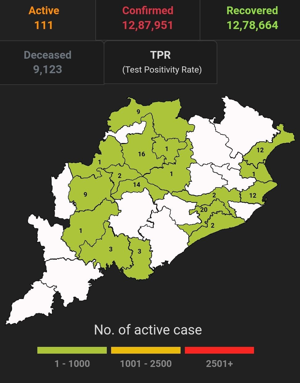 ଭୁବନେଶ୍ବର ୧୯/୦୪(ପିପିଟି); ରାଜ୍ୟରେ ନୂତନ ଆକ୍ରାନ୍ତ ସଂଖ୍ୟା ୧୩ ପଜିଟିଭ ସଂଖ୍ୟା ୧୨,୮୭,୯୫୧ ଚିହ୍ନଟ ହୋଇଛନ୍ତି ୧୨,୭୮,୬୬୪ ଜଣ ସୁସ୍ଥ ହୋଇଥିବା ବେଳେ ୧୧୧ ଜଣ ଚିକିତ୍ସିତ ହେଉଛନ୍ତି ଏବଂ ୯,୧୨୩ ଜଣଙ୍କର ମୃତ୍ୟୁ ଘଟିଛି ଏବଂ ଅନ୍ଯ ମୃତ୍ୟୁ ୫୩ ହୋଇଛି । ଖୋର୍ଦ୍ଧା ଜିଲ୍ଲାରେ ଆକ୍ରାନ୍ତ ସଂଖ୍ୟା ୨,୪୪,୮୨୧ ସୁସ୍ଥ ସଂଖ୍ୟା ୨,୪୩,୦୪୨ ଚିକିତ୍ସିତ ସଂଖ୍ୟା ୨୦ ମୃତ ସଂଖ୍ୟା ୧୭୪୯, କଟକ ଜିଲ୍ଲାରେ ଆକ୍ରାନ୍ତ ସଂଖ୍ୟା ୧,୧୩,୭୩୩, ସୁସ୍ଥ ସଂଖ୍ୟା ୧,୧୨,୮୨୦ ଚିକିତ୍ସିତ ସଂଖ୍ୟା ୦୩, ମୃତ ସଂଖ୍ୟା ୯୦୭, ଗଞ୍ଜାମ ଜିଲ୍ଲାରେ ଆକ୍ରାନ୍ତ ସଂଖ୍ୟା ୩୬,୭୫୬ ସୁସ୍ଥ ସଂଖ୍ୟା ୩୬,୨୩୬ ଚିକିତ୍ସିତ ସଂଖ୍ୟା ୦, ମୃତ ସଂଖ୍ୟା ୫୧୨ ସୁନ୍ଦରଗଡ ଜିଲ୍ଲାରେ ଆକ୍ରାନ୍ତ ସଂଖ୍ୟା ୯୦,୮୨୫ ସୁସ୍ଥ ସଂଖ୍ୟା ୯୦,୧୩୪ ଚିକିତ୍ସିତ ସଂଖ୍ୟା ୦୯ ମୃତ ସଂଖ୍ୟା ୬୮୧ ବୋଲି ସ୍ୱାସ୍ଥ୍ୟ ପରିବାର କଲ୍ୟାଣ ବିଭାଗ ତରଫରୁ ଏହି ସୂଚନା ମିଳିଛି।