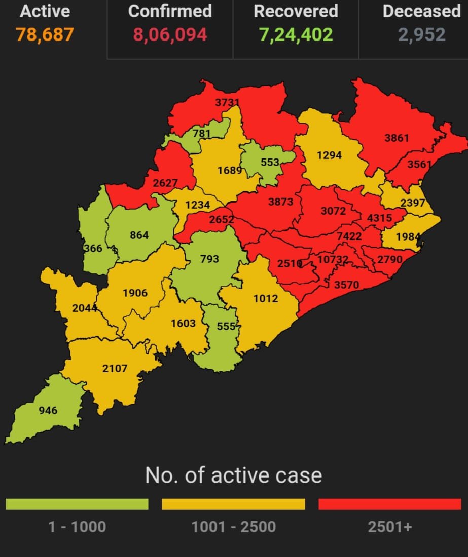 ଭୁବନେଶ୍ବର ୦୫/୦୬(ପିପିଟି); ରାଜ୍ୟରେ ନୂତନ ଆକ୍ରାନ୍ତ ସଂଖ୍ୟା ୭୩୯୫। ପଜିଟିଭ ସଂଖ୍ୟା ୮,୦୬,୦୯୪ ଚିହ୍ନଟ ହୋଇଛନ୍ତି ୭,୨୪,୪୦୨ ଜଣ ସୁସ୍ଥ ହୋଇଥିବା ବେଳେ ୭୮,୬୮୭ ଜଣ ଚିକିତ୍ସିତ ହେଉଛନ୍ତି ଏବଂ ୨୯୫୨ ଜଣଙ୍କର ମୃତ୍ୟୁ ଘଟିଛି ଏବଂ ଅନ୍ଯ ମୃତ୍ୟୁ ୫୩ ହୋଇଛି । ଖୋର୍ଦ୍ଧା ଜିଲ୍ଲାରେ ଆକ୍ରାନ୍ତ ସଂଖ୍ୟା ୧,୨୦,୪୦୩ ସୁସ୍ଥ ସଂଖ୍ୟା ୧,୦୯,୧୭୦ ଚିକିତ୍ସିତ ସଂଖ୍ୟା ୧୦,୭୩୨, ମୃତ ସଂଖ୍ୟା ୪୯୧ କଟକ ଜିଲ୍ଲାରେ ଆକ୍ରାନ୍ତ ସଂଖ୍ୟା ୬୫,୩୦୭ ସୁସ୍ଥ ସଂଖ୍ୟା ୫୭,୭୦୧ ଚିକିତ୍ସିତ ସଂଖ୍ୟା ୭୪୨୨, ମୃତ ସଂଖ୍ୟା ୧୮୦, ଗଞ୍ଜାମ ଜିଲ୍ଲାରେ ଆକ୍ରାନ୍ତ ସଂଖ୍ୟା ୩୨,୧୬୯ ସୁସ୍ଥ ସଂଖ୍ୟା ୩୦,୮୬୧ ଚିକିତ୍ସିତ ସଂଖ୍ୟା ୧୦୧୨, ମୃତ ସଂଖ୍ୟା ୨୮୮, ସୁନ୍ଦରଗଡ ଜିଲ୍ଲାରେ ଆକ୍ରାନ୍ତ ସଂଖ୍ୟା ୫୬,୧୮୫ ସୁସ୍ଥ ସଂଖ୍ୟା ୫୨,୧୬୮ ଚିକିତ୍ସିତ ସଂଖ୍ୟା ୩୭୩୧ ,ମୃତ ସଂଖ୍ୟା ୨୮୨ , ମାଲକାନଗିରି ଜିଲ୍ଲାରେ ଆକ୍ରାନ୍ତ ସଂଖ୍ୟା ୮,୭୫୦ ସୁସ୍ଥ ସଂଖ୍ୟା ୭,୭୬୯ ଚିକିତ୍ସିତ ସଂଖ୍ୟା ୯୪୬ ,ମୃତ ସଂଖ୍ୟା ୩୨ ବୋଲି ସ୍ୱାସ୍ଥ୍ୟ ପରିବାର କଲ୍ୟାଣ ବିଭାଗ ତରଫରୁ ଏହି ସୂଚନା ମିଳିଛି।