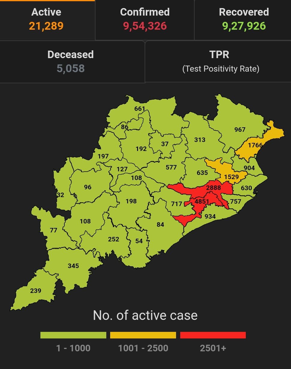 ଭୁବନେଶ୍ବର ୧୮/୦୭(ପିପିଟି); ରାଜ୍ୟରେ ନୂତନ ଆକ୍ରାନ୍ତ ସଂଖ୍ୟା ୨୨୧୫ । ପଜିଟିଭ ସଂଖ୍ୟା ୯,୫୪,୩୨୬ ଚିହ୍ନଟ ହୋଇଛନ୍ତି ୯,୨୭,୯୨୬ ଜଣ ସୁସ୍ଥ ହୋଇଥିବା ବେଳେ ୨୧,୨୮୯ ଜଣ ଚିକିତ୍ସିତ ହେଉଛନ୍ତି ଏବଂ ୫୦୫୮ ଜଣଙ୍କର ମୃତ୍ୟୁ ଘଟିଛି ଏବଂ ଅନ୍ଯ ମୃତ୍ୟୁ ୫୩ ହୋଇଛି । ଖୋର୍ଦ୍ଧା ଜିଲ୍ଲାରେ ଆକ୍ରାନ୍ତ ସଂଖ୍ୟା ୧,୪୩,୯୮୮ ସୁସ୍ଥ ସଂଖ୍ୟା ୧,୩୮,୨୩୦ ଚିକିତ୍ସିତ ସଂଖ୍ୟା ୪,୮୫୧, ମୃତ ସଂଖ୍ୟା ୮୯୭ କଟକ ଜିଲ୍ଲାରେ ଆକ୍ରାନ୍ତ ସଂଖ୍ୟା ୮୩,୪୮୨ ସୁସ୍ଥ ସଂଖ୍ୟା ୮୦,୨୭୯ ଚିକିତ୍ସିତ ସଂଖ୍ୟା ୨,୮୮୮, ମୃତ ସଂଖ୍ୟା ୩୧୧, ଗଞ୍ଜାମ ଜିଲ୍ଲାରେ ଆକ୍ରାନ୍ତ ସଂଖ୍ୟା ୩୩,୨୯୯ ସୁସ୍ଥ ସଂଖ୍ୟା ୩୨,୭୮୮ ଚିକିତ୍ସିତ ସଂଖ୍ୟା ୮୪, ମୃତ ସଂଖ୍ୟା ୪୧୬, ସୁନ୍ଦରଗଡ ଜିଲ୍ଲାରେ ଆକ୍ରାନ୍ତ ସଂଖ୍ୟା ୬୦,୨୨୯ ସୁସ୍ଥ ସଂଖ୍ୟା ୫୯,୧୨୪ ଚିକିତ୍ସିତ ସଂଖ୍ୟା ୬୬୧ ,ମୃତ ସଂଖ୍ୟା ୪୪୦,ମାଲକାନଗିରି ଜିଲ୍ଲାରେ ଆକ୍ରାନ୍ତ ସଂଖ୍ୟା ୧୧,୨୮୮ ସୁସ୍ଥ ସଂଖ୍ୟା ୧୧,୦୦୬ ଚିକିତ୍ସିତ ସଂଖ୍ୟା ୨୩୯ ,ମୃତ ସଂଖ୍ୟା ୪୦ ବୋଲି ସ୍ୱାସ୍ଥ୍ୟ ପରିବାର କଲ୍ୟାଣ ବିଭାଗ ତରଫରୁ ଏହି ସୂଚନା ମିଳିଛି।
