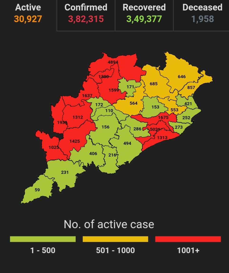 ଭୁବନେଶ୍ବର ୨୧/୦୪(ପିପିଟି); ରାଜ୍ୟରେ ନୂତନ ଆକ୍ରାନ୍ତ ସଂଖ୍ୟା ୪୮୫୧। ପଜିଟିଭ ସଂଖ୍ୟା ୩,୮୨,୩୧୫ ଚିହ୍ନଟ ହୋଇଛନ୍ତି ୩,୪୯,୩୭୭ଜଣ ସୁସ୍ଥ ହୋଇଥିବା ବେଳେ ୩୦,୯୨୭ ଜଣ ଚିକିତ୍ସିତ ହେଉଛନ୍ତି ଏବଂ ୧୯୫୮ ଜଣଙ୍କର ମୃତ୍ୟୁ ଘଟିଛି ଏବଂ ଅନ୍ଯ ମୃତ୍ୟୁ ୫୩ ହୋଇଛି । ଖୋର୍ଦ୍ଧା ଜିଲ୍ଲାରେ ଆକ୍ରାନ୍ତ ସଂଖ୍ୟା ୬୦,୦୪୦ ସୁସ୍ଥ ସଂଖ୍ୟା ୫୪,୬୬୮ ଚିକିତ୍ସିତ ସଂଖ୍ୟା ୫୦୨୧, ମୃତ ସଂଖ୍ୟା ୩୪୧, କଟକ ଜିଲ୍ଲାରେ ଆକ୍ରାନ୍ତ ସଂଖ୍ୟା ୩୧,୬୨୨ସୁସ୍ଥ ସଂଖ୍ୟା ୨୯,୮୦୦ ଚିକିତ୍ସିତ ସଂଖ୍ୟା ୧୬୭୫, ମୃତ ସଂଖ୍ୟା ୧୪୩, ଗଞ୍ଜାମ ଜିଲ୍ଲାରେ ଆକ୍ରାନ୍ତ ସଂଖ୍ୟା ୨୨,୮୧୧, ସୁସ୍ଥ ସଂଖ୍ୟା ୨୨,୦୫୮ ଚିକିତ୍ସିତ ସଂଖ୍ୟା ୪୯୪ ମୃତ ସଂଖ୍ୟା ୨୫୧ ବୋଲି ସ୍ୱାସ୍ଥ୍ୟ ପରିବାର କଲ୍ୟାଣ ବିଭାଗ ତରଫରୁ ଏହି ସୂଚନା ମିଳିଛି।