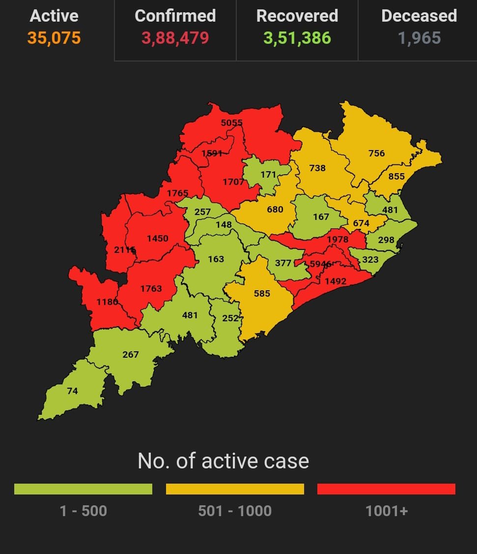 ଭୁବନେଶ୍ବର ୨୨/୦୪(ପିପିଟି); ରାଜ୍ୟରେ ନୂତନ ଆକ୍ରାନ୍ତ ସଂଖ୍ୟା ୬୧୬୪। ପଜିଟିଭ ସଂଖ୍ୟା ୩,୮୮,୪୭୯ ଚିହ୍ନଟ ହୋଇଛନ୍ତି ୩,୫୧,୩୮୬ ଜଣ ସୁସ୍ଥ ହୋଇଥିବା ବେଳେ ୩୫,୦୭୫ ଜଣ ଚିକିତ୍ସିତ ହେଉଛନ୍ତି ଏବଂ ୧୯୬୫ ଜଣଙ୍କର ମୃତ୍ୟୁ ଘଟିଛି ଏବଂ ଅନ୍ଯ ମୃତ୍ୟୁ ୫୩ ହୋଇଛି । ଖୋର୍ଦ୍ଧା ଜିଲ୍ଲାରେ ଆକ୍ରାନ୍ତ ସଂଖ୍ୟା ୬୧,୧୭୨ ସୁସ୍ଥ ସଂଖ୍ୟା ୫୪,୮୭୪ ଚିକିତ୍ସିତ ସଂଖ୍ୟା ୫୯୪୬, ମୃତ ସଂଖ୍ୟା ୩୪୨, କଟକ ଜିଲ୍ଲାରେ ଆକ୍ରାନ୍ତ ସଂଖ୍ୟା ୩୧,୯୮୨ ସୁସ୍ଥ ସଂଖ୍ୟା ୨୯,୮୫୭ ଚିକିତ୍ସିତ ସଂଖ୍ୟା ୧୯୭୮, ମୃତ ସଂଖ୍ୟା ୧୪୩, ଗଞ୍ଜାମ ଜିଲ୍ଲାରେ ଆକ୍ରାନ୍ତ ସଂଖ୍ୟା ୨୨,୯୪୬, ସୁସ୍ଥ ସଂଖ୍ୟା ୨୨,୧୦୦ ଚିକିତ୍ସିତ ସଂଖ୍ୟା ୫୮୫ ମୃତ ସଂଖ୍ୟା ୨୫୩, ସୁନ୍ଦରଗଡ ଜିଲ୍ଲାରେ ଆକ୍ରାନ୍ତ ସଂଖ୍ୟା ୨୩,୦୫୫, ସୁସ୍ଥ ସଂଖ୍ୟା ୧୭,୮୧୮, ଚିକିତ୍ସିତ ସଂଖ୍ୟା ୫୦୫୫, ମୃତ ସଂଖ୍ୟା ୧୭୮ ବୋଲି ସ୍ୱାସ୍ଥ୍ୟ ପରିବାର କଲ୍ୟାଣ ବିଭାଗ ତରଫରୁ ଏହି ସୂଚନା ମିଳିଛି।