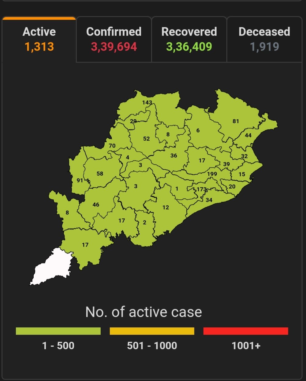 ଭୁବନେଶ୍ବର ୨୬/୦୩(ପିପିଟି); ରାଜ୍ୟରେ ନୂତନ ଆକ୍ରାନ୍ତ ସଂଖ୍ୟା ୨୩୪। କରୋନା ପଜିଟିଭ ସଂଖ୍ୟା ୩,୩୯,୬୯୪ ଚିହ୍ନଟ ହୋଇଛନ୍ତି ୩,୩୬,୪୦୯ଜଣ ସୁସ୍ଥ ହୋଇଥିବା ବେଳେ ୧୩୧୩ଜଣ ଚିକିତ୍ସିତ ହେଉଛନ୍ତି ଏବଂ ୧,୯୧୯ ଜଣଙ୍କର ମୃତ୍ୟୁ ଘଟିଛି ଏବଂ ଅନ୍ଯ ମୃତ୍ୟୁ ୫୩ ହୋଇଛି । ଖୋର୍ଦ୍ଧା ଜିଲ୍ଲାରେ ଆକ୍ରାନ୍ତ ସଂଖ୍ୟା ୫୩,୫୨୯ସୁସ୍ଥ ସଂଖ୍ୟା ୫୩,୦୦୬ ଚିକିତ୍ସିତ ସଂଖ୍ୟା ୧୭୩, ମୃତ ସଂଖ୍ୟା ୩୪୦, କଟକ ଜିଲ୍ଲାରେ ଆକ୍ରାନ୍ତ ସଂଖ୍ୟା ୨୯,୪୪୪, ସୁସ୍ଥ ସଂଖ୍ୟା ୨୯,୦୯୯ ଚିକିତ୍ସିତ ସଂଖ୍ୟା ୧୯୯, ମୃତ ସଂଖ୍ୟା ୧୪୨, ଗଞ୍ଜାମ ଜିଲ୍ଲାରେ ଆକ୍ରାନ୍ତ ସଂଖ୍ୟା ୨୧,୯୪୧, ସୁସ୍ଥ ସଂଖ୍ୟା ୨୧,୬୭୩, ଚିକିତ୍ସିତ ସଂଖ୍ୟା ୧୨, ମୃତ ସଂଖ୍ୟା ୨୪୮ ବୋଲି ସ୍ୱାସ୍ଥ୍ୟ ପରିବାର କଲ୍ୟାଣ ବିଭାଗ ତରଫରୁ ଏହି ସୂଚନା ମିଳିଛି।