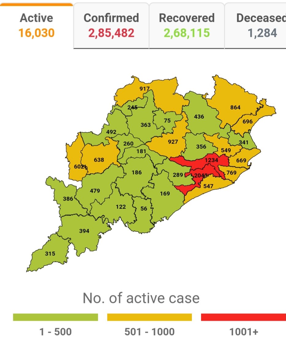 ଭୁବନେଶ୍ବର,୨୮/୧୦(ପିପିଟି); ରାଜ୍ୟରେ ନୂତନ ଆକ୍ରାନ୍ତ ସଂଖ୍ୟା ୧,୫୪୦ । ବର୍ତ୍ତମାନ ସୁଦ୍ଧା ୪୪,୨୨,୧୬୪ ଜଣଙ୍କ ଟେଷ୍ଟ ସରିଛି । ସେଥି ମଧ୍ୟରୁ କରୋନା ପଜିଟିଭ ୨,୮୫,୪୮୨ ଚିହ୍ନଟ ହୋଇଛନ୍ତି ୨,୬୮,୧୧୫ ଜଣ ସୁସ୍ଥ ହୋଇଥିବା ବେଳେ ୧୬,୦୩୦ ଜଣ ଚିକିତ୍ସିତ ହେଉଛନ୍ତି ଏବଂ ୧,୨୮୪ ଜଣଙ୍କର ମୃତ୍ୟୁ ଘଟିଛି ଏବଂ ଅନ୍ଯ ମୃତ୍ୟୁ ୫୩ ହୋଇଛି । ସ୍ୱାସ୍ଥ୍ୟ ପରିବାର କଲ୍ୟାଣ ବିଭାଗ ତରଫରୁ ଏହି ସୂଚନା ମିଳିଛି । ନୂତନ ଆକ୍ରାନ୍ତ ୧,୫୪୦ ଜଣଙ୍କ ମଧ୍ୟରୁ ୮୮୬ କ୍ବାରେଣ୍ଟାଇନ୍ ସେଣ୍ଟର ଓ ୬୫୪ ଜଣ ସ୍ଥାନୀୟ ଅଞ୍ଚଳର ବୋଲି ଜଣାପଡିଛି ।