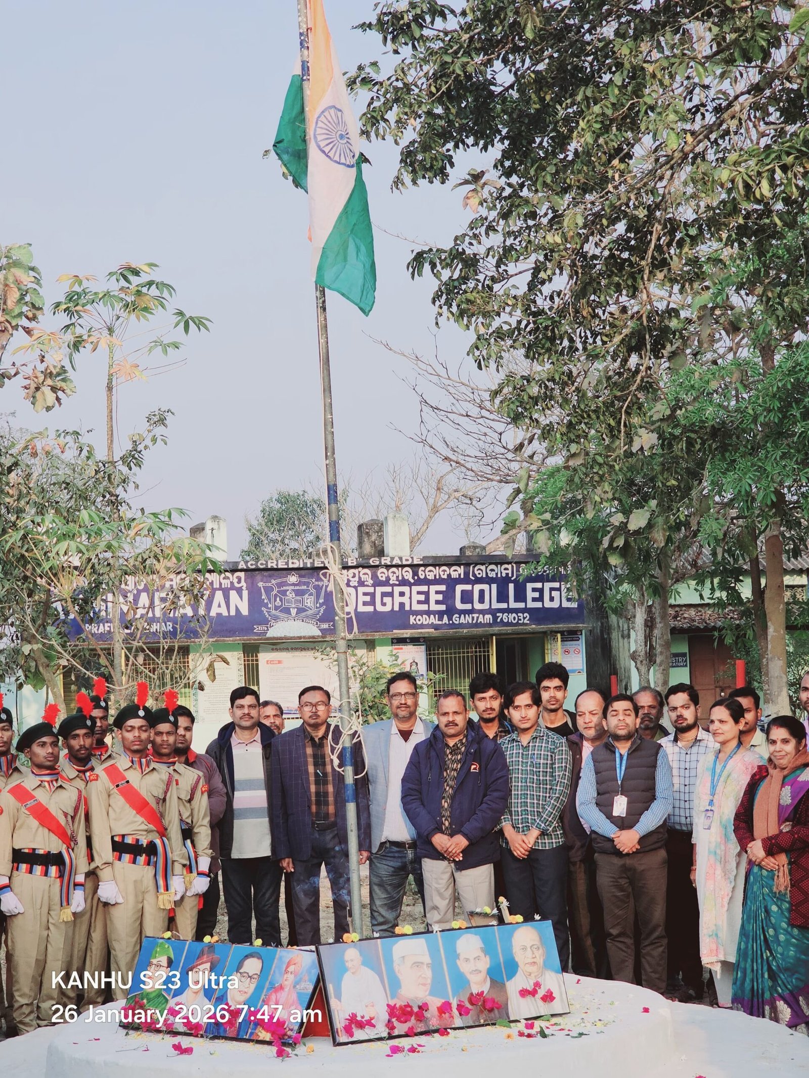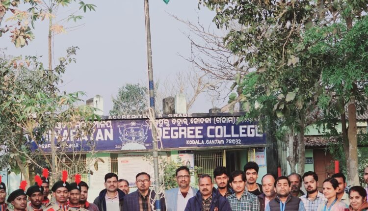 କୋଦଳା,୨୬/୦୧(ପିପିଟି):କୋଦଳା ସ୍ଥିତ ଲଷ୍ମୀନାରାୟଣ ସ୍ନାତକ ମହାବିଦ୍ୟାଳୟ ରେ ୭୭ ତମ ସାଧାରଣତନ୍ତ୍ର ଦିବସ ପାଳିତ ହୋଇଯାଇଛି। ମହାବିଦ୍ୟାଳୟ ଅଧ୍ୟକ୍ଷ ରଘୁନାଥ ମୁଦୁଲି ଜାତୀୟ ପତାକାକୁ ଉତ୍ତୋଳନ କରି ଆଜିର ଦିବସର ମହତ୍ୱ ବିଷୟରେ କହିଥିଲେ । ସମସ୍ତ ଅଧ୍ୟାପକ, ଅଧ୍ୟାପିକା,ଅଣ କର୍ମଚାରୀ ସମେତ ଜାତୀୟ ସେବା ଯୋଜନା,ଯୁବ ରେଡ଼କ୍ରସ ଓ ଜାତୀୟ ସମର ଶିକ୍ଷାର୍ଥୀ ବାହିନୀର ସମସ୍ତ ଛାତ୍ରଛାତ୍ରୀ, ପ୍ରୋଗ୍ରାମ ଅଧିକାରୀଙ୍କ ମିଳିତ ସହାୟତାରେ ଆଜିର କାର୍ଯ୍ୟକ୍ରମ ଅନୁଷ୍ଠିତ ହୋଇଥିଲା ।