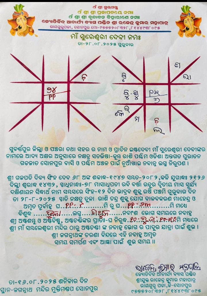 ସୁବର୍ଣ୍ଣପୁର ,୧୬/୦୮(ପିପିଟି):ସୋନପୁର ଗଡ଼ଜାତ ଓ ପଞ୍ଚରା ଅଞ୍ଚଳ ପାଇଁ ନୁଆଁଖାଇ ଲଗ୍ନ ସ୍ଥାନୀୟ ବଡ ଜଗନ୍ନାଥ ମନ୍ଦିର ପରିସରରେ ଥିବା ମୁକ୍ତିମଣ୍ଡପ ରେ ପଣ୍ଡିତ ମହାସଭା ବସି ଲଗ୍ନ ନିର୍ଘଣ୍ଟ ସ୍ଥିର କରାଯାଇଛି। ଏ ନେଇ ସୋନପୁର ମ୍ୟୁନିସିପାଲଟି ଦ୍ବାରା ଆହୂତ ଏକ ବୈଠକ ଅନୁଷ୍ଠିତ ହୋଇଥିଲା । ଚଳିତ ବର୍ଷ ଅଗଷ୍ଟ ୨୮ ତାରିଖ ଗୁରୁବାର ପଞ୍ଚମୀ ଦିନ ଘ.୧୧.୦୯ ମି ରୁ ଘ.୧୧.୨୩ମି ମଧ୍ୟେ ବିଶୁଦ୍ଧ ତୂଳା ଲଗ୍ନ କୁମ୍ଭ ନବାଂଶ ଭୋଗ ସମୟରେ ନୂଆଁଖାଇ ଲଗ୍ନ ସ୍ଥିର ହୋଇଥିବା ବେଳେ ପ୍ରାତଃ ୧୦ ଘଣ୍ଟା ରୁ ୧୦.୫୦ ମି ମଧ୍ୟେ ସମଲେଶ୍ଵରୀ ମନ୍ଦିର ରୁ ମା ସୁରେଶ୍ୱରୀଙ୍କ ପାଇଁ ପାହୁର ଯାତ୍ରା ବାହାରିବ ଓ ଅଷ୍ଟ ଚଣ୍ଡି, ଅଷ୍ଟ ଶମ୍ଭୁ ଓ ଅଷ୍ଟ ବିଷ୍ଣୁ ଙ୍କ ଠାରେ ନବାହ୍ନ ଲାଗି ହେଲା ପରେ ନିଜ ନିଜ ଇଷ୍ଟ ଦେବୀ ଓ ସାଧାରଣ ଜନତା ନବାହ୍ନ ଭକ୍ଷଣ କରିବେ। ବହୁ ପୂର୍ବରୁ ସୋନପୁର ଗଡ଼ଜାତ ରାଜ୍ୟର ନୁଆଖାଇ ପାଇଁ ଏହି ଲଗ୍ନ ପରମ୍ପରା ଚାଲିଆସି ଥିବା ବେଳେ ପ୍ରତିବର୍ଷ ସୋନପୁରର ବଡ ଜଗନ୍ନାଥ ମନ୍ଦିର ର ମୁକ୍ତି ମଣ୍ଡପରେ ବସି ପଣ୍ଡିତ ମାନେ ଲଗ୍ନ ନିର୍ଘଣ୍ଟ ସ୍ଥିର କରିଥାନ୍ତି । ସୋନପୁରର ଇଷ୍ଟଦେବୀ ମା ସୁରେଶ୍ୱରୀଙ୍କ ନାମ ଜ୍ୟୋତିଷି ଶାସ୍ତ୍ର ଅନୁସାରେ ତିଥି ଓ ଲଗ୍ନ ନିର୍ଘଣ୍ଟ ଗଣନା କରାଯାଇ ଥାଏ ଚଳିତ ବର୍ଷ ଜ୍ୟୋତିର୍ବିଦ ପଣ୍ତିତ ରାଜେନ୍ଦ୍ର କୁମାର ମହାପାତ୍ର ଲଗ୍ନ ନିର୍ଘଣ୍ଟ କରିଥିଲେ।ଆଜିର ଏହି ଲଗ୍ନ ନିର୍ଘଣ୍ଟ ସଭାରେ ଜିଲ୍ଲାର ବହୁ ବିଶିଷ୍ଟ ପଣ୍ଡିତ ମାନଙ୍କ ସହ ଗୌରୀ ଶଙ୍କର ରଥ ଉପସ୍ଥିତ ଥିଲେ। ବୈଠକରେ ସୋନପୁର ପୌରାଧ୍ୟକ୍ଷା ତାମସୀ ତାମସ୍ମିତା ନାଏକ, ପୌର ପରିଷଦ ନିର୍ବାହୀ ଅଧିକାରୀ ଋଷି ମାଝି, ପୂର୍ବତନ ପୌରାଧ୍ୟକ୍ଷ ପ୍ରକାଶ ଚନ୍ଦ୍ର ସାହୁ, ସମାଜସେବୀ ଶ୍ରୀବତ୍ସ ମଲ୍ଲିକ, ରାମ ଗୋପାଳ ପୂଜାରୀ, ମହେଶ ପୂଜାହାରୀ, ଅଚ୍ୟୁତ ପୂଜାରୀ, ଶଶାଙ୍କ ଶେଖର ସିଂଦେଓ, କାଉନସିଲର ରାଜୁ ପାତ୍ର, ତିୱାନୀ ଦାନୀ, ଅଚ୍ୟୁତ ପୂଜାରୀ, ଷଷ୍ଠୀ ବଡମାଳୀ, ଲଡ଼ୁ କିଶୋର ମଲ୍ଲିକ, ଶେଷଦେବ ମେହେର, ତ୍ରିଲୋଚନ ତରିଆ ପ୍ରମୁଖଙ୍କ ସମେତ ସହରର ବହୁ ଅନେକ ବିଦ୍ୱାନ ଓ ବୁଦ୍ଧିଜୀବି ମାନେ ଉପସ୍ଥିତ ଥିଲେ।