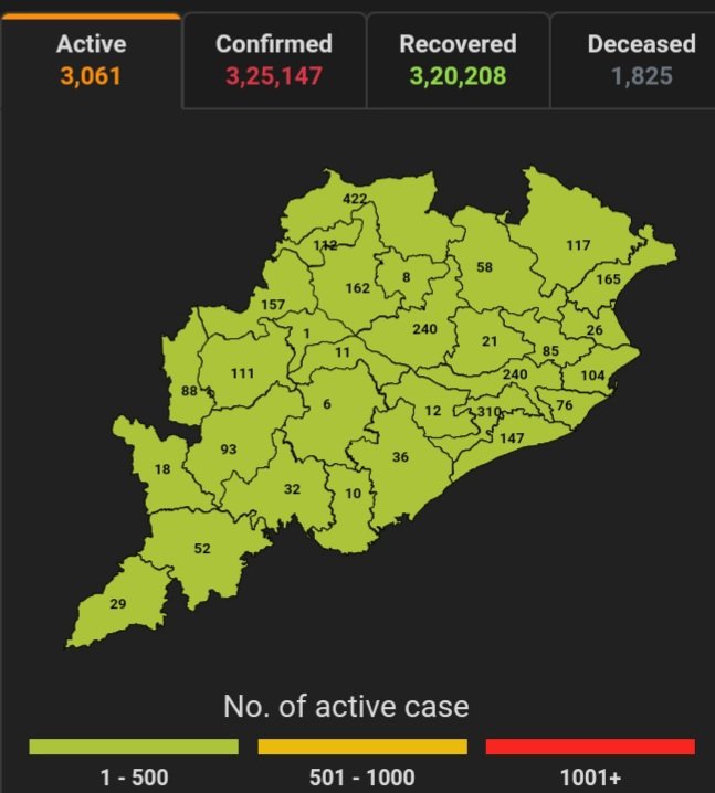 ଭୁବନେଶ୍ବର,୧୭/୧୨(ପିପିଟି);ରାଜ୍ୟରେ ନୂତନ ଆକ୍ରାନ୍ତ ସଂଖ୍ୟା ୩୫୧ । ବର୍ତ୍ତମାନ ସୁଦ୍ଧା ୬୫,୦୨,୪୫୧ ଜଣଙ୍କ ଟେଷ୍ଟ ସରିଛି । ସେଥି ମଧ୍ୟରୁ କରୋନା ପଜିଟିଭ ୩,୨୫,୧୪୭ ଚିହ୍ନଟ ହୋଇଛନ୍ତି ୩,୨୦,୨୦୮ ଜଣ ସୁସ୍ଥ ହୋଇଥିବା ବେଳେ ୩,୦୬୧ ଜଣ ଚିକିତ୍ସିତ ହେଉଛନ୍ତି ଏବଂ ୧,୮୨୫ ଜଣଙ୍କର ମୃତ୍ୟୁ ଘଟିଛି ଏବଂ ଅନ୍ଯ ମୃତ୍ୟୁ ୫୩ ହୋଇଛି । ସ୍ୱାସ୍ଥ୍ୟ ପରିବାର କଲ୍ୟାଣ ବିଭାଗ ତରଫରୁ ଏହି ସୂଚନା ମିଳିଛି । ନୂତନ ଆକ୍ରାନ୍ତ ୩୫୧ ଜଣଙ୍କ ମଧ୍ୟରୁ ୨୦୩ କ୍ବାରେଣ୍ଟାଇନ୍ ସେଣ୍ଟର ଓ ୧୪୮ ଜଣ ସ୍ଥାନୀୟ ଅଞ୍ଚଳର ବୋଲି ଜଣାପଡିଛି ।