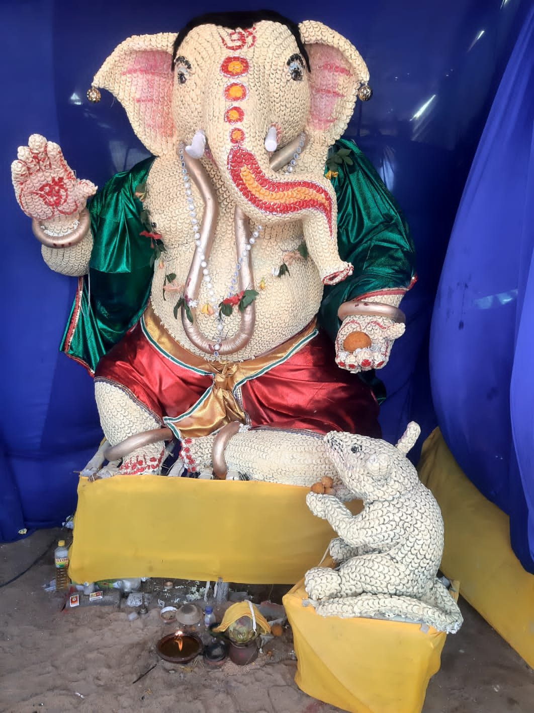ଭଞ୍ଜନଗର, ୨୩/୯(ପିପିଟି): ଏହି ଗଣେଶ ପୂଜା ଅବସରରେ ଚାରିଆଡ଼େ ବିଭିନ୍ନ ପ୍ରକାର ଛୋଟ ବଡ ଗଣେଶ ମୂର୍ତ୍ତି ତିଆରି ହୋଇଥିବା ବେଳେ ଗଞ୍ଜାମ ଜିଲ୍ଲା ଭଞ୍ଜନଗର ବାଉଁଶ ଲୁଣ୍ଡି ମଶାଣି ସାହିରେ ଏକ ନିଆରା ଗଣେଶ ପୂଜା ପାଉଛନ୍ତି।ଏହା କେବଳ ଗୋଟା କାଜୁରେ ନିର୍ମିତ ହୋଇଛି।ଗଣେଶଙ୍କ ବାହାନ ମୂଷିକ ମଧ୍ୟ କାଜୁରେ ତିଆରି ହୋଇଛି।ସାଢ଼େ ୭ଫୁଟ ଉଚ୍ଚତା ବିଶିଷ୍ଟ ଏହି ମୂର୍ତ୍ତିରେ ୯କେଜି ୫ଶହ ଗ୍ରାମ କାଜୁ ଲାଗିଛି।ମୂର୍ତ୍ତି ନିର୍ମାଣ ବାବଦରେ ପ୍ରାୟ ୧୫ହଜାର ଟଙ୍କା ଖର୍ଚ୍ଚ ହୋଇଥିବା ଜଣାପଡିଛି।ଏହାକୁ ଭଞ୍ଜନଗର ଅଞ୍ଚଳର ପ୍ରସିଦ୍ଧ ଚିତ୍ରଶିଳ୍ପୀ ଭି. ରାମା ରାଓଙ୍କ ପୁଅ ଭି. ଧର୍ମା ରାଓ ଏକ ମାସ ପରିଶ୍ରମ କରି ତିଆରି କରିଛନ୍ତି।ଏହି ପୂଜା ମଣ୍ଡପରେ ଦର୍ଶନ ପାଇଁ ଆଖପାଖ ଅଞ୍ଚଳର ବହୁ ଲୋକଙ୍କ ଭିଡ଼ ଲାଗି ରହିଛି।ଅନେକ ଲୋକ ଏଭଳି ଏକ ଅନନ୍ୟ ମୂର୍ତ୍ତିକୁ ଦେଖି ବେଶ ପ୍ରଶଂସା କରିଛନ୍ତି।ପୂଜା କମିଟି ପକ୍ଷରୁ ଆଗକୁ ମଧ୍ୟ ଏଭଳି ସ୍ୱତନ୍ତ୍ର ଗଣେଶ ମୂର୍ତ୍ତି ନିର୍ମାଣ କରିବାକୁ ଆଶା ରଖାଯାଇଛି।