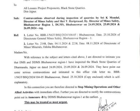 JAJPUR,19/11(PPT): The Steel and Mines department has directed lessees of All black stone quarries Undre Dharmasala tehsil In Jajpur District to stop mining operations and other allied activities. In a letter to the lessees, the deputy director of mines (DDM), Jajpur Circle, Jay Prakash Nayak Said them to suspend mining operations and other related activities in the quarries. The 26 black stone quarries are located in Bajabati, Rahadpur, Dankari, Baramana and Bichhakhandi hills. The directive from the deputy director of mines, Jajpur Circle came after the directorate of mines safety submitted a joint probe report. The inquiry order followed the mining safety assessment by director of Mines Safety Krishnendu Mondal and Deputy Director T Hari Prasad who inspected the 26 black stone quarries in September this year. The two-member team conducted a joint inquiry on the complaints of lapses in safety measures, non-compliance with mining rules and other contraventions related to safety and security not followed by the quarry operators during mining and other allied activities. “On the complaints of necessary and required safety measures not being implemented by the black stone quarry lessees during mining operations and other allied activities, two senior officials from the directorate of mines safety, Bhubaneswar office inspected the black stone quarries operating in Dharmasala area. During their three-day inspection, they found serious contraventions and pointed them out in the findings. Based on their inquiry report, the orders have been issued to as many as All black stone quarry lessees to stop mining and other allied activities in them,” said Nayak.