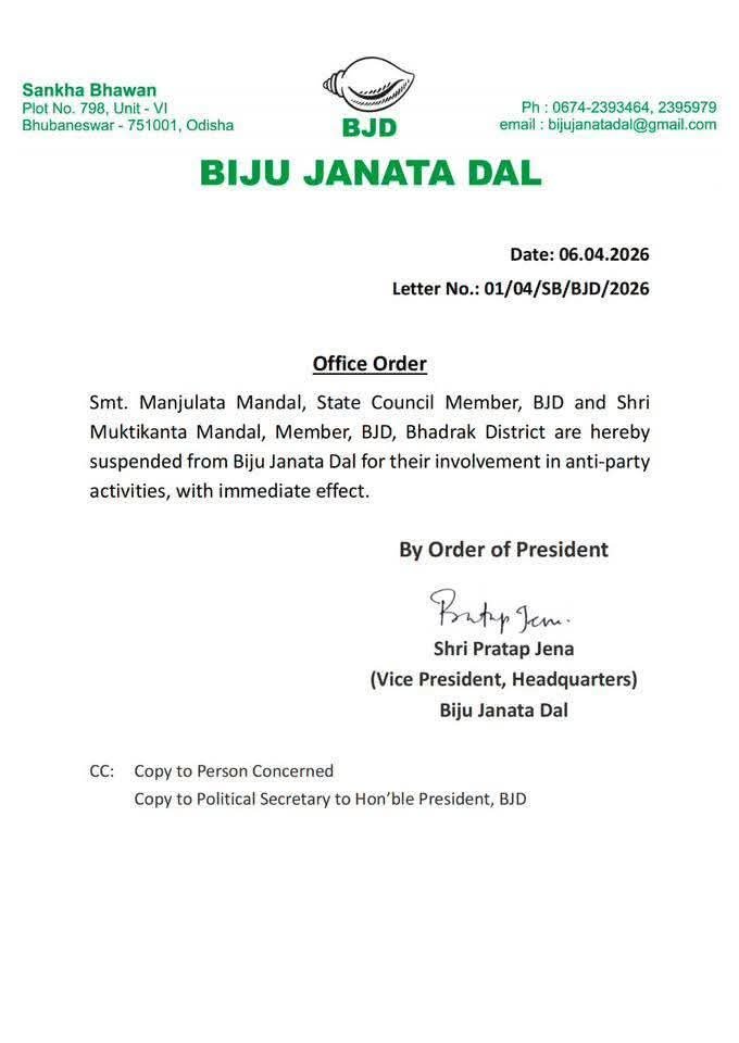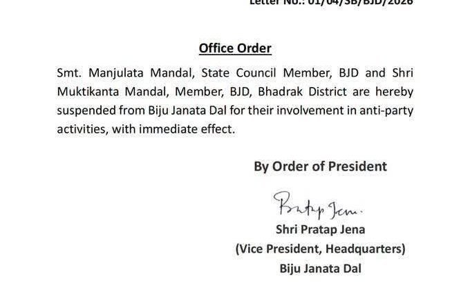 ଦୋବଲ,୦୬/୦୪: ଭଦ୍ରକ ଜିଲ୍ଲାର ରାଜନୀତିକ ମଞ୍ଚରେ ଆଜି ଏକ ବଡ଼ ପରିବର୍ତ୍ତନର ସୃଷ୍ଟି ହୋଇଛି। ବିଜୁ ଜନତା ଦଳ  ତରଫରୁ କଠୋର କାର୍ଯ୍ୟନୁଷ୍ଠାନ ଗ୍ରହଣ କରାଯାଇ, ଦଳବିରୋଧୀ କାର୍ଯ୍ୟରେ ସମ୍ପୃକ୍ତ ଥିବା ଅଭିଯୋଗରେ ଧାମନଗରର ପୂର୍ବତନ ବିଧାୟକ ମୁକ୍ତିକାନ୍ତ ମଣ୍ଡଳ ଏବଂ ଭଦ୍ରକର ପୂର୍ବତନ ସାଂସଦ ମଞ୍ଜୁଲତା ମଣ୍ଡଳଙ୍କୁ ଦଳରୁ ନିଲମ୍ବନ କରାଯାଇଛି।
