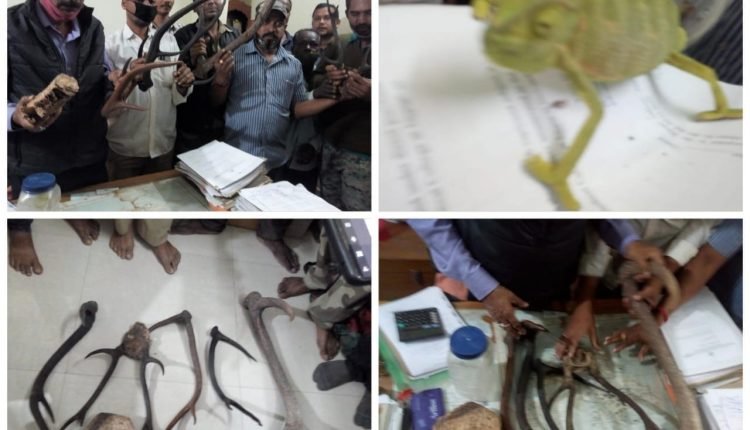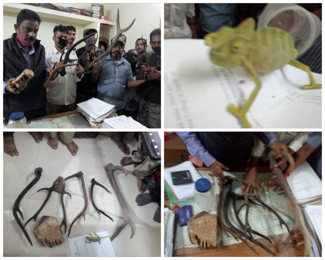 Jajpur,16/12(PPT); Forest officials have seized four kilograms of molar teeth of an elephant , five deer horns and one live chameleon and arrested two persons on the charge of poaching and illegal wildlife trade on Tuesday night in Jajpur district.The molar teeth of the elephant , deer horns and chameleon apparently were brought from the Kuldiha Wildlife Sanctuary in Balasore district by the both arrested persons . They were trying to sell the seized items . We arrested them when they came to Bhikipur village under Jajpur road forest range to sell the wildlife items. Both the arrested persons have been identified as Sidharth Raj (23) of Nilagiri and Dibyalochan Sahoo (22 ) of Jajpur Road, said Debendra Kumar Patnaik, the range officer of Jajpur Road forest. We suspect that there is a chain of smugglers involved in this type of trade and will try to reach out to them through the duo , added the forest officer. A case has been registered against them under sections- 39, 44, 48 ,49 and 51 of the Wildlife Protection Act 1972 . On Wednesday , they were produced in the court at Jajpur Road .The court rejected their bail applications and remanded them in jail custody, added the forest officer.