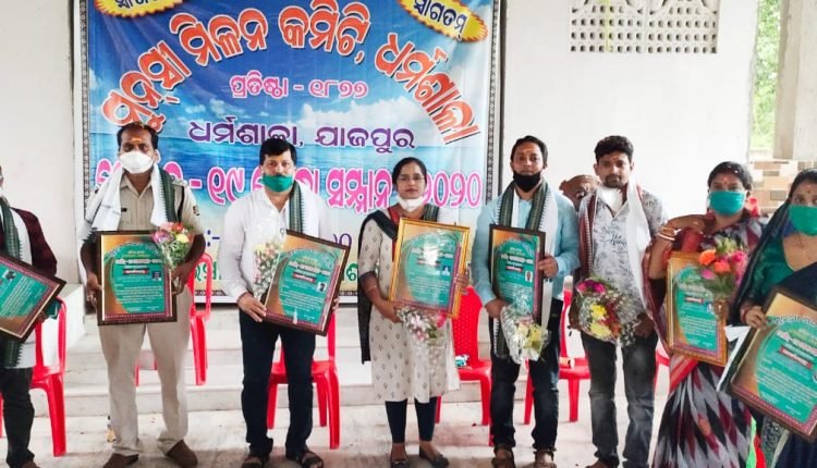 Dharmasala,04/06,Munsi Milan Committee of Dharmasala on Thursday felicitated Dharmasla tehesildar Saroj Kumar Panda, Block Development Officer Smita Rath, Dharmasala IIC Saroj Kumar Sahoo, Dharamsala Medical Officer Manas Kumar Swain and additional tehesildar Debi Prasad Mohanty and many other Sarapanches, journalists and medical staff as Covid warrriors.