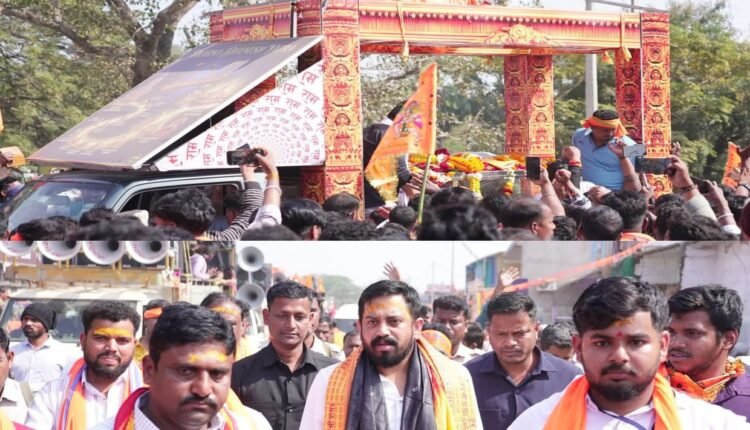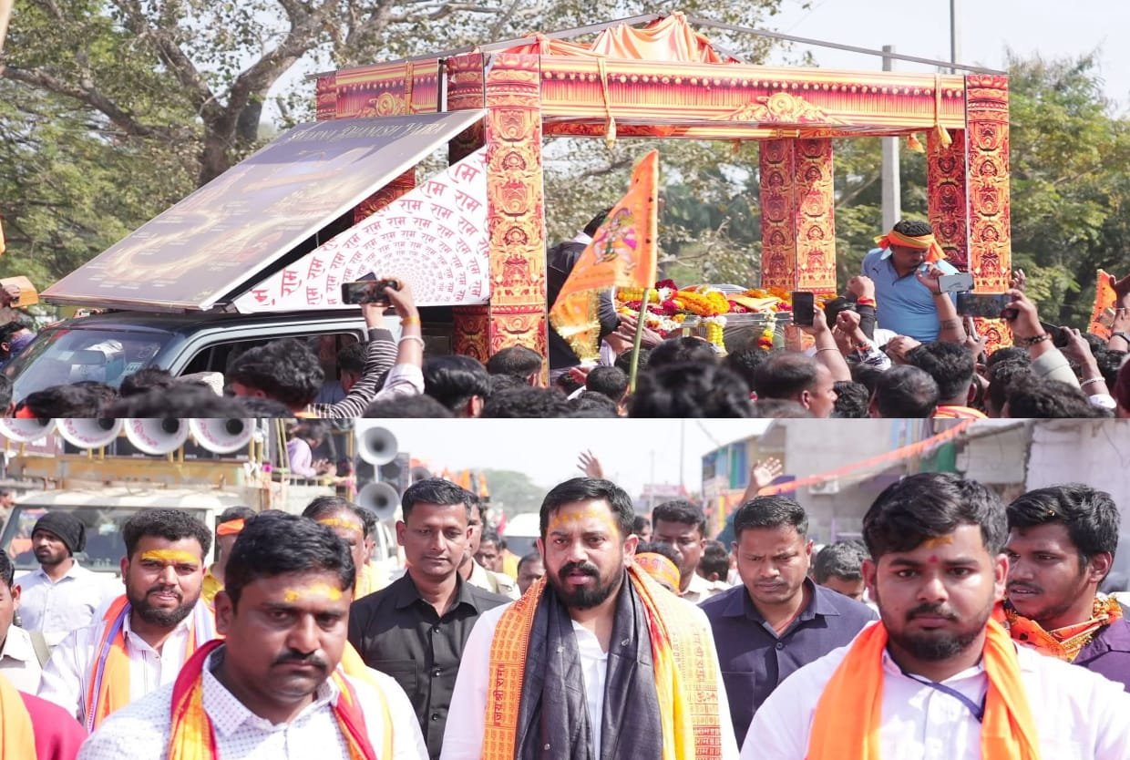 Jajpur,16/01(PPT):A 286-kg ‘swarna dhanush’ (golden bow) yatra organised by the Sanatan Jagarana Manch, at kuakhia in Jajpur on Friday.The yatra will pass through several districts of Odisha before departing from Puri’s Jagannath Dham on January 19 and culminating at Ayodhya on January 22. The bow measures 8 feet in length and 3 feet in width, and weighs 286 kg. It is made up of 240 kg of copper, 2.5 kg of silver, 20 kg of mica, 22 kg of iron, and 1 kg of gold used as 10-micron plating.The bow, inscribed with tributes to India’s military achievements from Kargil to Operation Sindoor, was made by 40 women artisans from Kanchipuram in Tamil Nadu. It has an idol of Lord Jagannath and a filigree crown.Dharmasala MLA Himanshu sekhar Sahoo Senior & BJP leaders, were present. MLA Himanshu said The yatra carried a large, sacred bow as a symbol of Sanatani faith, devotion, and tradition& Devotees gathered in large numbers to welcome the yatra as it passed through their towns, chanting “Jai Shri Ram” and offering prayers, viewing it as a historic and holy journey connecting Odisha to Ayodhya.